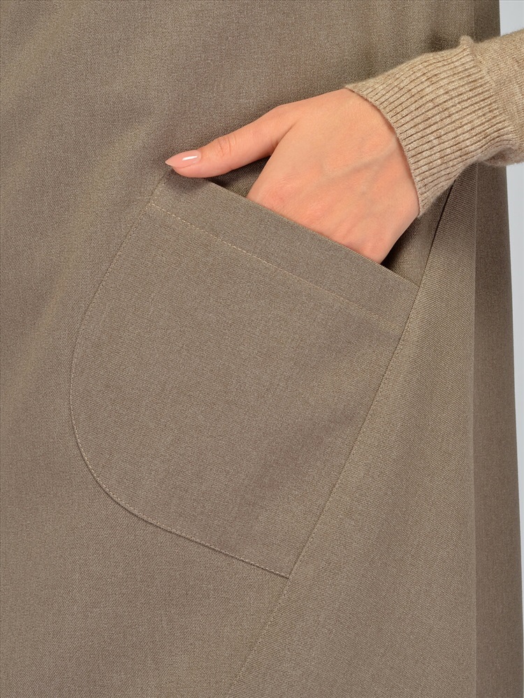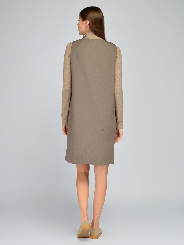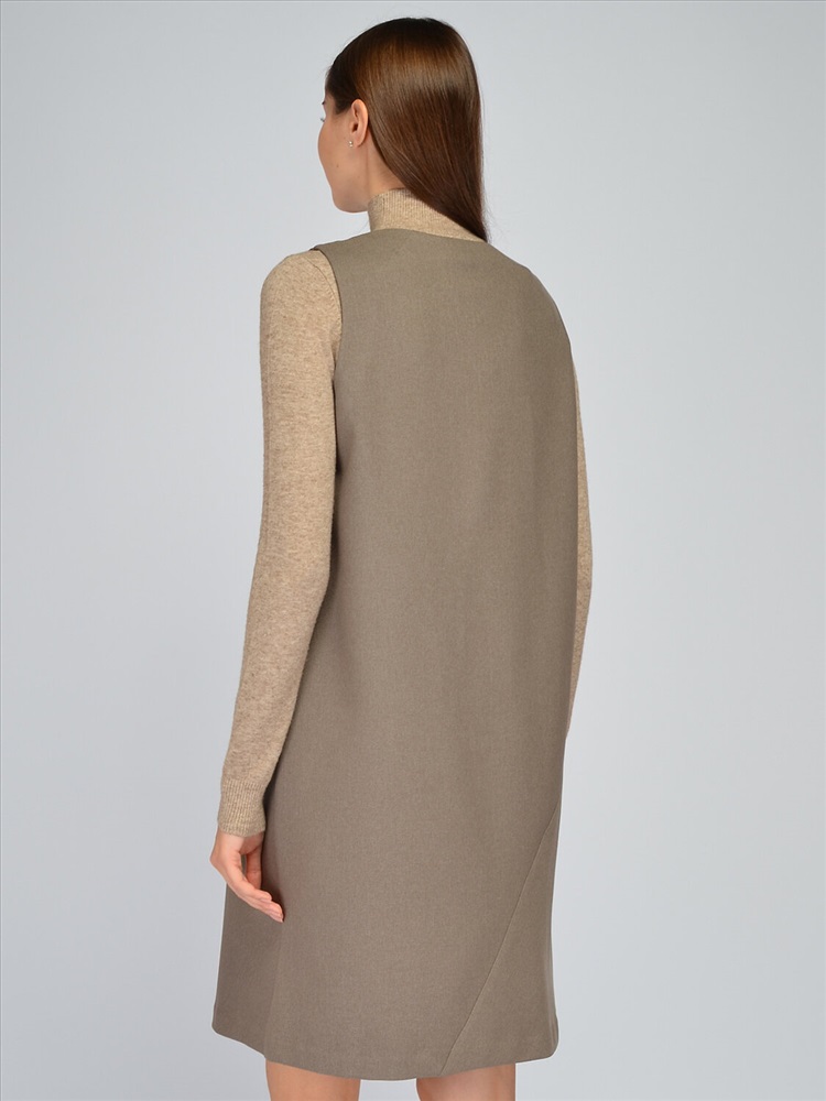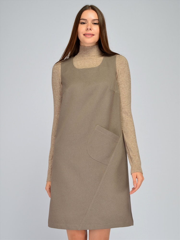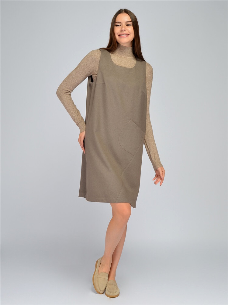 Теплое платье без рукавов прекрасно впишется в строгие образы. Лаконичный фасон свободного кроя не акцентирует внимание на особенностях фигуры, а практичная длина подойдет женщинам разного роста. Теплый сарафан выполнен из приятной плотной ткани, которая не колется и обладает высокой износостойкостью. Широкая пройма не сковывает движений, подойдет даже для полных объемов рук, а также позволяет поддеть под платье свитер или водолазку. Элегантный вырез горловины не будет давить на шею, добавляя образу воздушности. Спереди на платье миди находится асимметричный карман, который может пригодиться для ключей или телефона. На груди предусмотрены вытачки, чтобы модель идеально села на любую фигуру. Классический теплый сарафан будет прекрасно смотреться в офисе, на рабочей встрече, на культурном мероприятии или празднике. Базовое повседневное платье без рукавов прямого кроя сочетается с деловой обувью и сдержанными украшениями.