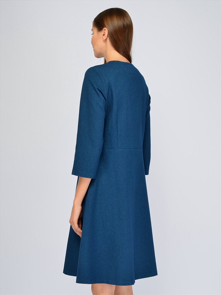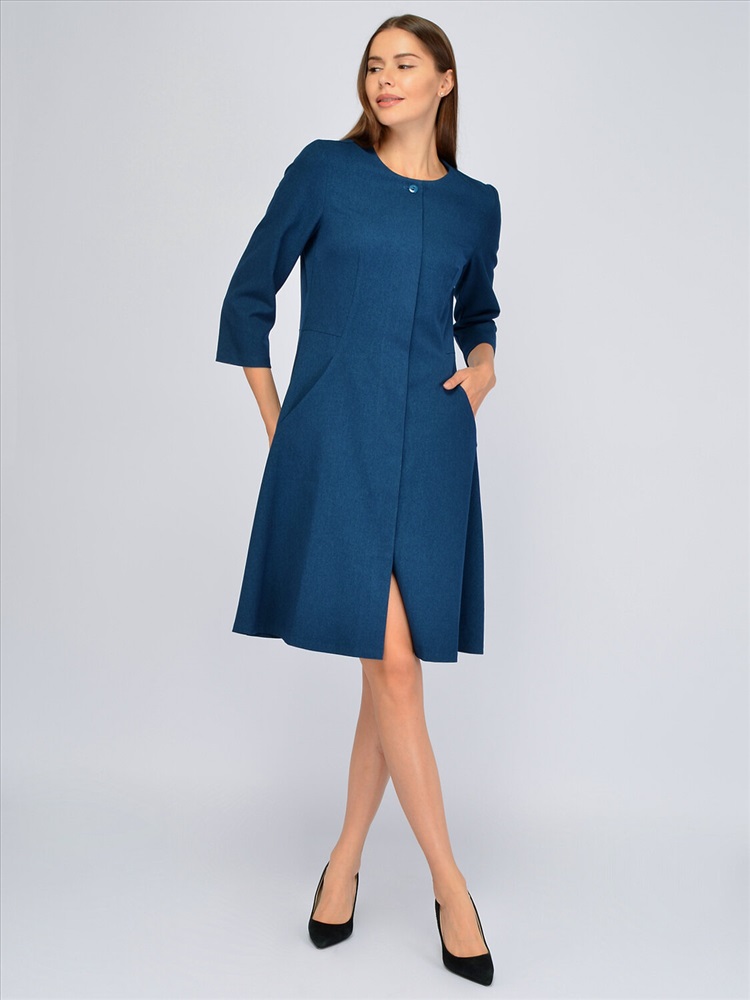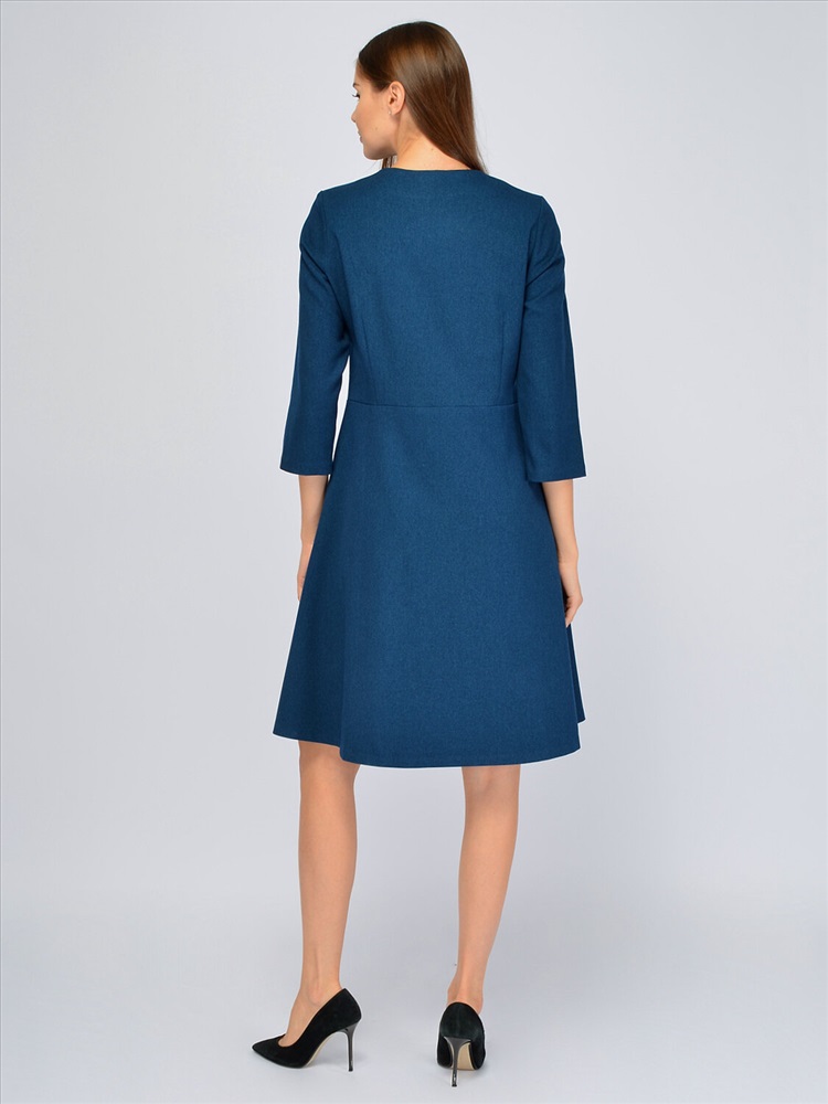 Лаконичное платье миди станет универсальным вариантом для разных случаев в осенне-зимний период. Аккуратный округлый вырез горловины изящно обрамляет шею и не давит на нее. В меру свободные рукава три четверти подчеркивают предплечья и запястья и не сковывают движений. Изделие выполнено из приятной качественной ткани, за которой легко ухаживать и гладить. Благодаря плотной ткани и приталенному крою с расклешенной юбкой платье скроет возможные недостатки фигуры, не акцентируя на них внимание. По бокам располагаются практичные карманы для хранения нужных мелочей. От карманов проходят вертикальные вытачки, что визуально вытягивает силуэт. Застегивается изделие на потайные пуговицы спереди, которые скрыты за вертикальной планкой. Строгое и благородное платье до середины колена впишется в официальные и нарядные образы в прохладное время года. Дополните его туфлями, сапогами или ботильонами, а также актуальными украшениями и аксессуарами. Классическая модель подойдет девушкам и женщинам, которые выбирают строгий дресс-код, желая оставаться женственными и элегантными.