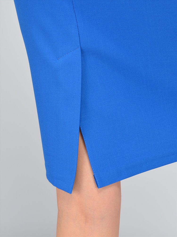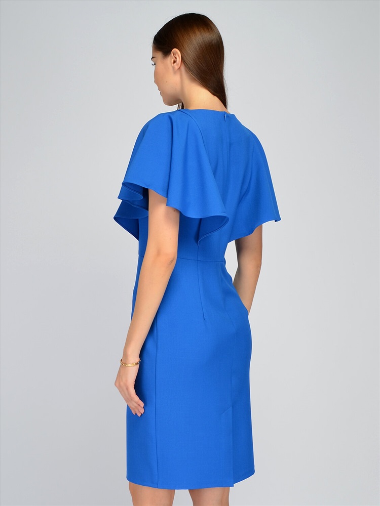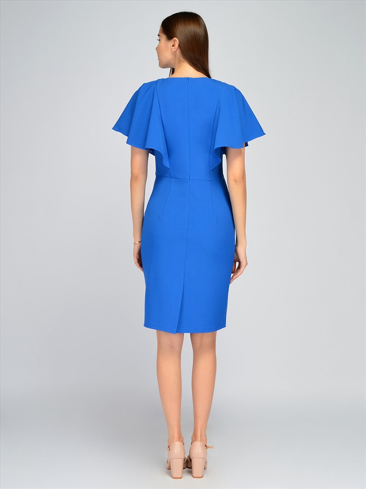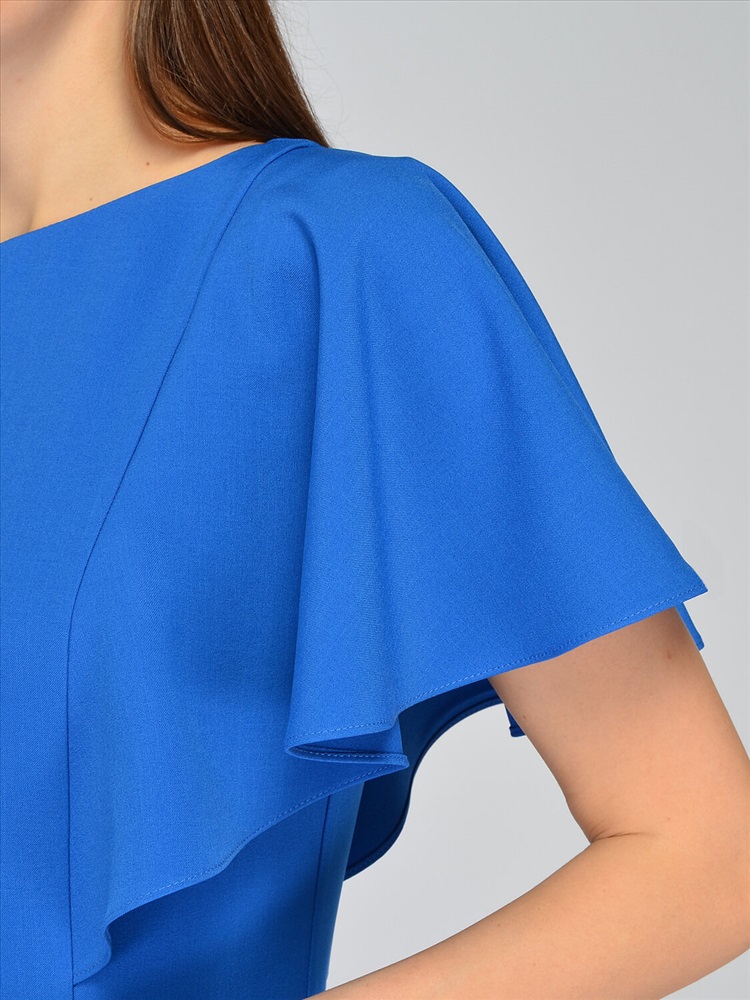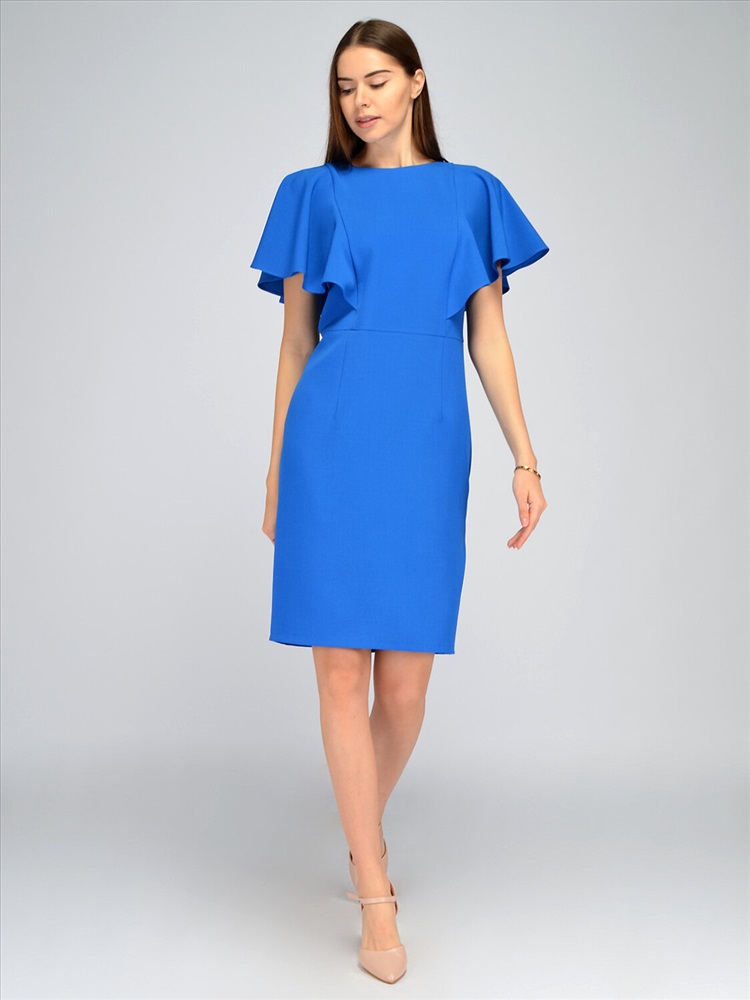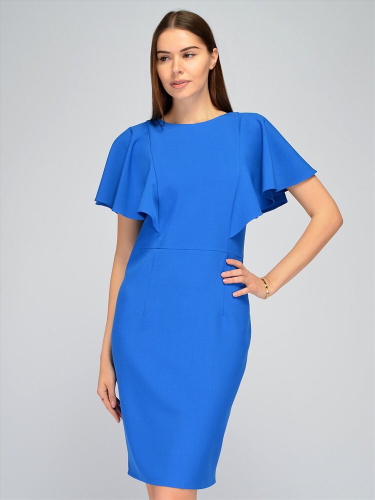 Нарядное платье миди классического кроя поможет создать романтичный летний образ. У платья аккуратный округлый вырез горловины, который не давит на шею и придает скромности. Модель имеет приталенный силуэт, моделируя женственные пропорции фигуры. Чтобы визуально добавить несколько сантиметров росту и обеспечить идеальную посадку, на платье есть вертикальные вытачки. Главное особенностью модели являются его короткие рукава воланы. Свободные рукава со складками не будут сковывать движений и эффектно выделят Вас на любом мероприятии. Для удобства при ходьбе сзади предусмотрена элегантная шлица. Застегивается модель на потайную молнию на спине. Приталенное платье футляр подойдет как молодым девушкам, так и взрослым женщинам. Праздничное платье выше колена будет идеальным выбором для культурных мероприятий, вечеринок, значимых событий. Завершите образ подходящими аксессуарами и обувью на высоком ходу.