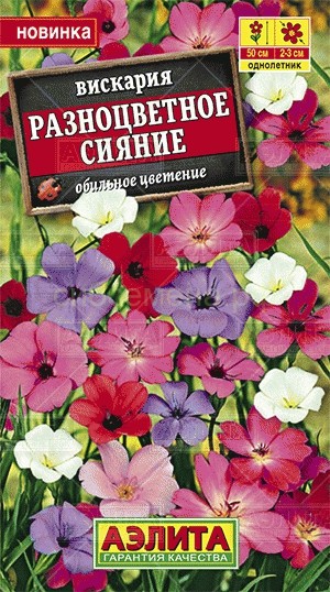 Обильно цветущий летник из семейства Гвоздичных. Смесь цветет в июле–сентябре и включает четыре окраски: белую, красную, сиреневую и розовую – по 25%. Кусты прямостоячие, многостебельные, до 50 см высотой. Стебли сильно ветвятся. Простые пятилепестковые цветочки Ø 2-3 см собраны в рыхлые метельчатые соцветия. Огромная масса цветов буквально образует разноцветные облака над посадками. За красоту цветения растение получило название «небесная роза». Вискария красиво смотрится массивами. Используется для объемного наполнения цветников вместе с другими летниками.