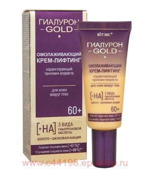 "Умная" формула, в составе которой 3 вида гиалуроновой кислоты, биозолото, шелковая акация и сложные высоконаучные омолаживающие и осветляющие комплексы, оказывает направленное действие на все признаки возраста: уменьшает мимические и глубокие морщинки вокруг глаз, снимает отечность, подтягивает кожу верхнего и нижнего века, осветляет темные круги, освежает взгляд. Сразу после нанесения крема мгновенно возникает эффект подтяжки, который сохраняется в течение всего дня. Особые лифтинг-компоненты образуют на коже невидимую поддерживающую микросеточку-корсет против морщин. Доказанная эффективность компонентов: Увеличение синтеза собственной гиалуроновой кислоты* +93% Лифтинг верхнего века** +61% Улучшение гладкости кожи* +66% Стимуляция синтеза коллагена* +21% Гиалуроновая кислота трех молекулярных размеров проникает во все слои эпидермиса, активизируя глубокий клеточный метаболизм и возрождая ресурс молодости кожи. 1. Высокомолекулярная гиалуроновая кислота увлажняет кожу в верхних слоях, подтягивает, выравнивает ее тон, дарит свежесть, яркость и сияние. 2. Среднемолекулярная гиалуроновая кислота проникает в средние слои кожи, стимулирует выработку собственной гиалуроновой кислоты, повышает упругость, плотность и эластичность кожи. 3. Низкомолекулярная гиалуроновая кислота действует в самых глубоких слоях эпидермиса, наполняя кожу влагой и «выталкивая» морщинки изнутри, укрепляя и подтягивая кожу, обеспечивает мощный омолаживающий эффект пролонгированного действия. Биозолото выступает в роли проводника, позволяя активным компонентам быстрее и глубже проникать в кожу, значительно повышая эффективность их воздействия, усиливая процессы омоложения. В комплексе с гиалуроновой кислотой и шелковой акацией помогает восстановить объем мягких тканей и структуру кожи в месте образования морщин, обеспечивает активное укрепление структуры кожи, защищает от возрастных изменений. Шелковая акация обладает исключительными омолаживающими и восстанавливающими свойствами, дарит коже глубокое увлажнение, разглаживает морщины, помогает быстро уменьшить «мешочки» под глазами. Сложные высоконаучные омолаживающие и осветляющие комплексы работают в синергии, т.е. дополняют и усиливают действие друг друга: моментально подтягивают кожу вокруг глаз, эффективно уменьшают темные круги, заметно разглаживают сеточку морщинок вокруг глаз. Результат: при регулярном применении кожа вокруг глаз преображается, морщинки становятся значительно меньше, темные круги и припухлости постепенно исчезают, тон кожи выравнивается, становится чистым, свежим и нежным. Максимальный результат достигается при комплексном применении средств линии. Эффект накапливается и сохраняется надолго. Составвода, глицерилстеарат/цитрат, глицерилстеарат, стеариловый спирт, бегениловый спирт, глицерин, гидролизованный экстракт клубня Manihot Esculenta (маниока), сквалан, дикаприлилкарбонат, масло Butyrospermum parkii (ши), гиалуронат натрия, полиметилметакрилат, циклопентасилоксан, кроссполимер диметикона, ППГ-15 стеариловый эфир, кроссполимер диметикона/винилдиметикона, диоксид кремния, бутиленгликоль, сополимер акрилоилдиметилтаурата аммония и винилпирролидона, стеарилдиметикон, октадецен, камедь Acacia Senegal (сенегальской акации), гидролизованная ризобиевая камедь, экстр