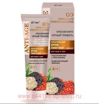 Активная формула действует в течение всей ночи, обеспечивая полноценный омолаживающий уход коже после 60 лет. Мощные компоненты анти-старения (красная икра, черный трюфель, ценнейшие высокопитательные масла, инновационный комплекс Essenskin) глубоко насыщают кожу веществами, которые помогают устранить повреждения в ее структуре, полученные в течение дня. Напитанная, увлажненная, укрепленная, к утру кожа разглаживается и подтягивается (эффект лифтинга), уменьшается видимость морщин, восстанавливаются утраченные объемы лица, возвращается свежий, ровный, яркий цвет лица. Красная икра насыщает клетки незаменимыми питательными и восстанавливающими веществами, делает кожу упругой и эластичной, способствует быстрому и заметному улучшению внешнего вида кожи, возвращая ей гладкость и свежесть, обеспечивая красивый нежный цвет лица. Черный трюфель – изысканный деликатес для кожи, обладающий непревзойденными омолаживающими свойствами. Замедляет процессы естественного старения кожи, увлажняет и питает, уменьшает провисания, помогает разгладить даже глубокие морщины. Инновационный комплекс Essenskin стимулирует заполнение и разглаживание даже глубоких морщин, уплотняет матрикс, подтягивает контуры лица, придает шелковистую гладкость и свежесть. Результаты поразительны: уже через несколько применений заметно явное уменьшение морщин, повышение тонуса и упругости кожи, восстановление объемов и четких очертаний лица. Применение: нанесите вечером на очищенную кожу лица и шеи.