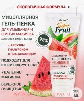 SUPER FRUIT Мицеллярная гель-пенка для умывания и снятия макияжа с арбузом, гиалуроном и ниацинамидом. Гель-пенка, разработанная экспертами ВИТЭКС по уникальной рецептуре без сульфатов, красителей и парабенов, бережно очищает кожу лица и вокруг глаз от макияжа и загрязнений, не раздражая и не пересушивая. ГИАЛУРОН, НИАЦИНАМИД, АРБУЗ и ФРУКТОВЫЙ МИКС из чиа, золотого апельсина, зизифуса, кале, моринги, сезама, индийского граната и цитруса сацума превосходно увлажняют и разглаживают кожу, повышают ее тонус и упругость, выравнивают цвет лица. Комментарии к товару