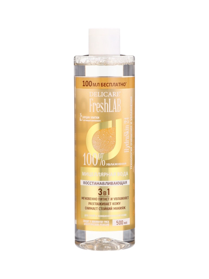 Габариты: 6 x 6 x 22,5 Страна: Россия В боксе: 18 шт Состав: См. на упаковке Материалы: см. на упаковке Фасовка: по 1 шт Индивидуальная упаковка: Без упаковки Сертификат: ЕАС Тип кожи: Комбинированная, Сухая Вода мицеллярная Delicare, восстанавливающая, с улиточной слизью — это очищающее средство для лица объёмом 500 мл, разработанное для мягкого, но эффективного удаления макияжа, загрязнений и излишков кожного себума, при этом оказывающее восстановительное воздействие на кожу. Производитель — российский бренд Delicare, а средство представлено в удобном объёме, подходящем для регулярного ухода. Данная мицеллярная вода сочетает традиционную технологию мицелл с активными ингредиентами, которые помогают поддерживать чистоту и баланс кожи. Улиточная слизь, включённая в формулу, известна своими восстанавливающими свойствами: она способствует увлажнению и поддержанию барьерной функции эпидермиса, помогает смягчать кожу и снижать видимые признаки усталости. Это делает средство подходящим не только для удаления макияжа, но и для бережного ухода после умывания. ([flap.kz][1]) Средство предназначено для всех типов кожи и может использоваться как утром, так и вечером. Оно эффективно справляется с очищением кожи на первом этапе ухода, легко наносится с помощью ватного диска и оставляет кожу свежей, чистой и подготовленной к нанесению последующих продуктов ухода за лицом. Удобный объём 500 мл делает мицеллярную воду практичным выбором для домашнего применения, а благодаря мягкой текстуре она подходит для ежедневного использования в рамках повседневного ухода за кожей. Комментарии к товару