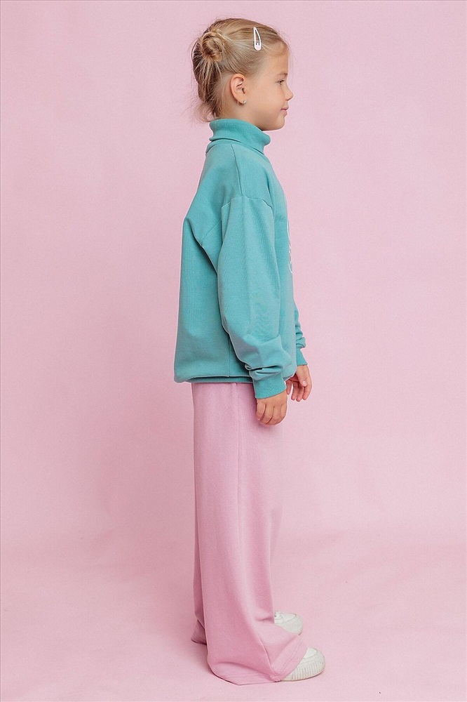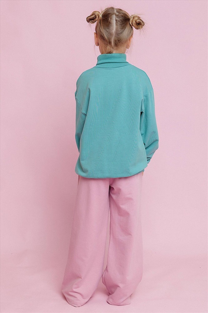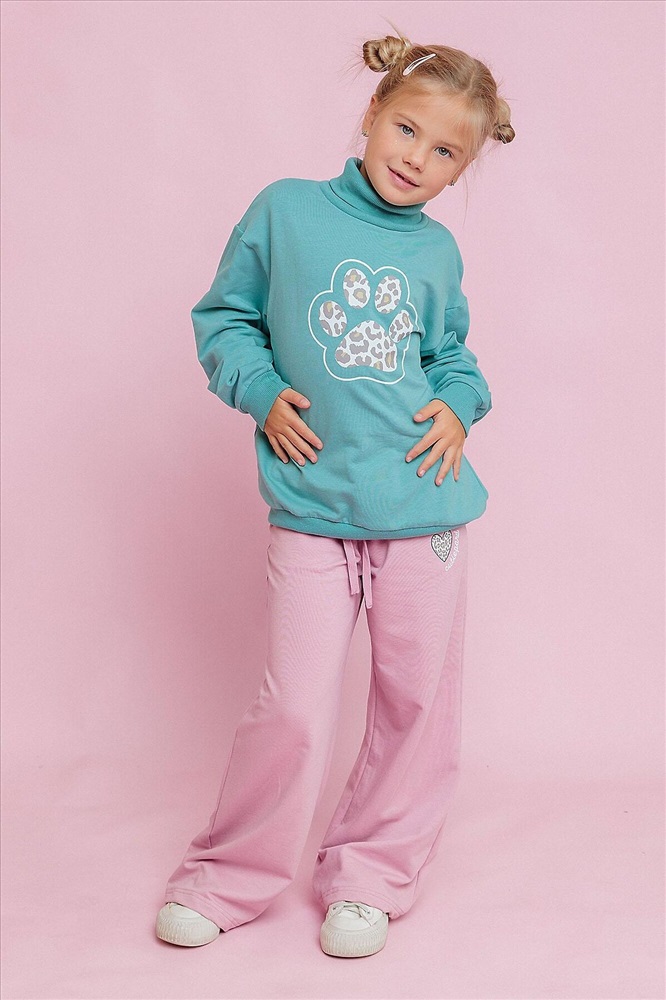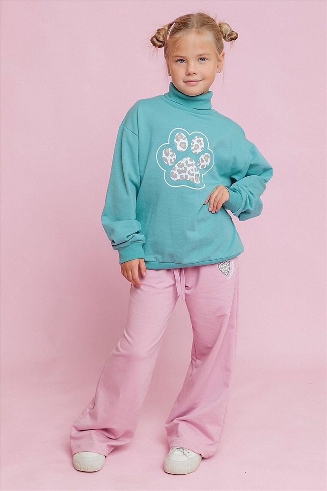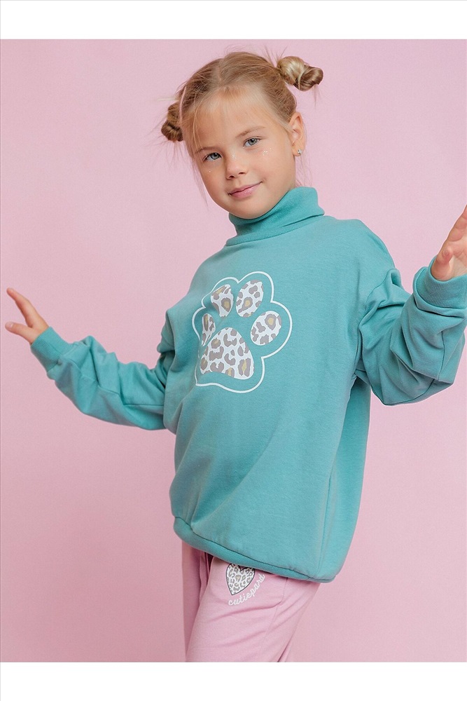 Водолазка с длинным рукавом для девочки голубая из футера с начесом. Объемная водолазка кроя оверсайз с принтом в виде лапы на груди. Плотная ткань с хлопковым составом хорошо пропускает воздух и позволяет телу дышать.