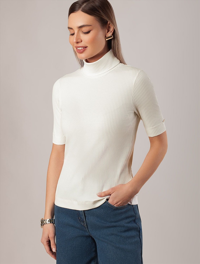 Водолазка с коротким рукавом выполнена из фактурного трикотажа в рубчик. Модель идеально сидит по фигуре не сковывая движения. Хлопковый трикотаж поддерживает оптимальную температуру тела, поэтому в изделии будет комфортно в течении всего дня. Наличие эластана в составе гарантирует формоустойчивости. Водолазка отлично впишется в деловой дресс-код и подойдет для повседневного аутфита.