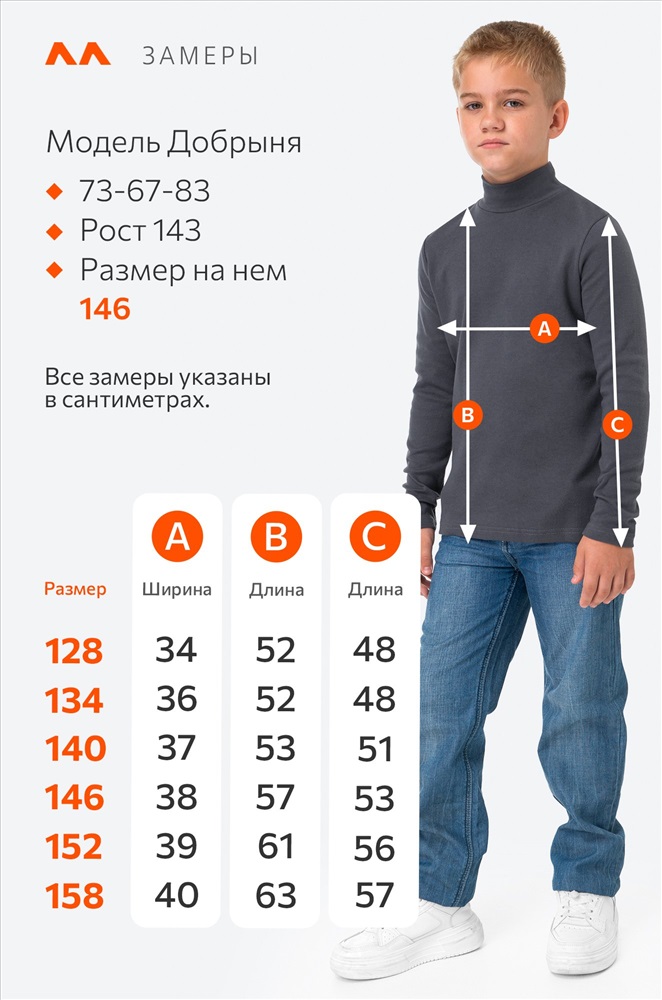 Модель Добрыня, его рост 143, параметры:73-67-83. На нем 146 размер.
