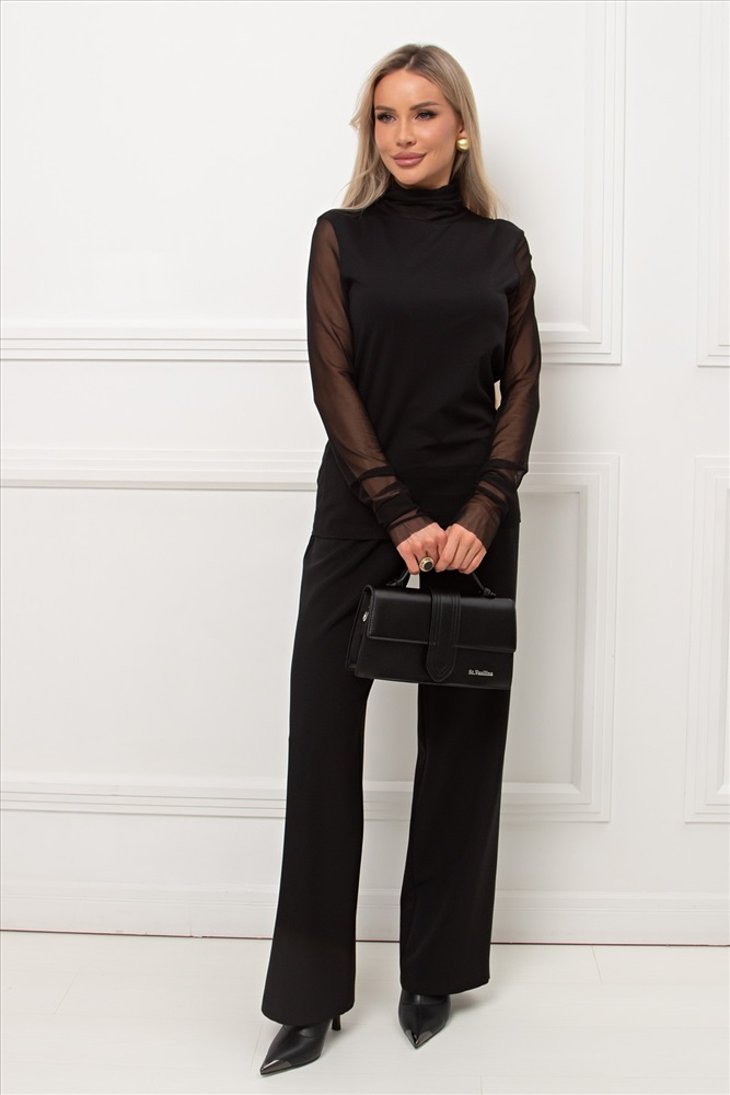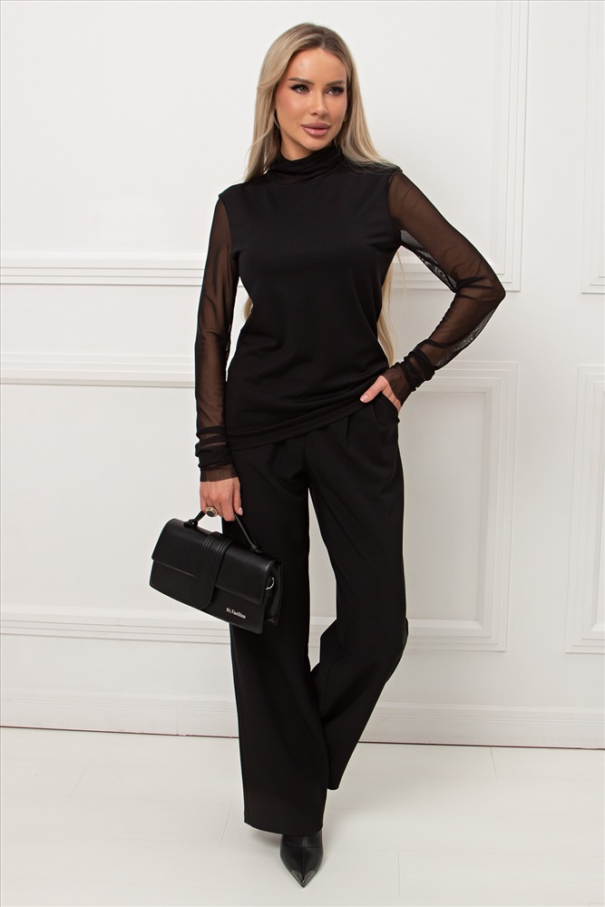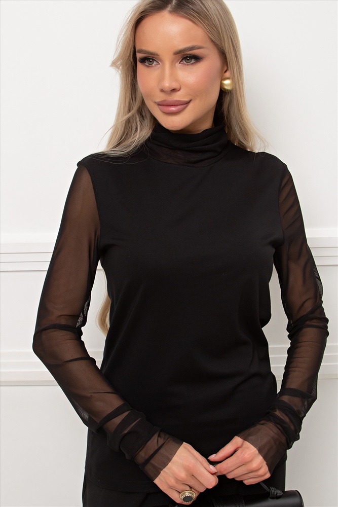 Водолазка прилегающего силуэта из трикотажного полотна. Втачные длинные рукава из сетки. Горловина оформлена воротником - хомут из сетки. Низ ровный, без разрезов.