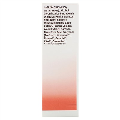 ИнгредиентыWater, alcohol, glycerin, aloe barbadensis leaf juice, punica granatum fruit juice, panicum miliaceum (millet) seed extract, prunus spinosa wood extract, xanthan gum, citric acid, fragrance (parfum)*, limonene*, linalool*, geraniol*, citral*, coumarin*. *From natural essential oils Комментарии к товару