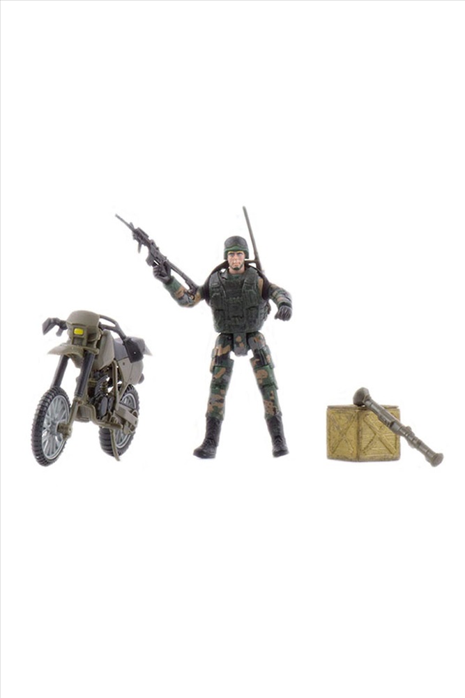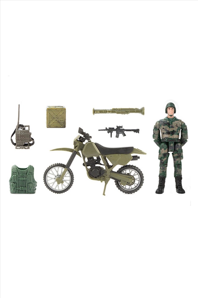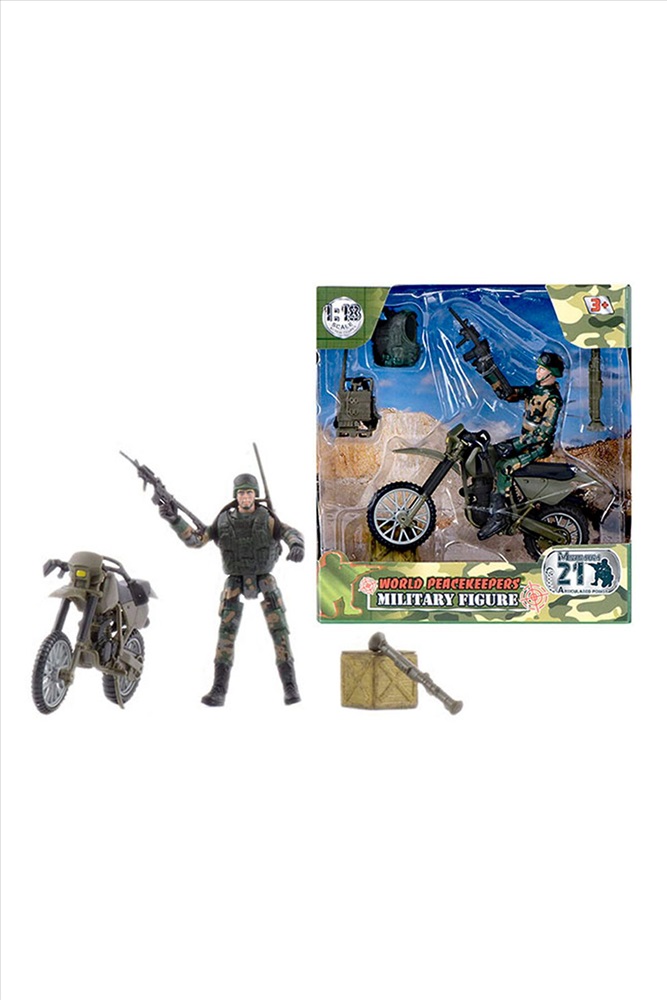 Масштабные игровые наборы World Peacekeepers с отлично детализированными фигурками, военной техникой и военными аксессуарами. Благодаря точкам артикуляции фигурки могут принимать любые позы и стойки. Мальчишкам понравится воссоздавать большое количество игровых ситуаций, используя технику и аксессуары разных видов войск. Фигурка солдата в камуфляже и каске с 22 точками артикуляции и высокой детализацией, фигурка выполнена в масштабе 1:18, высота 9,53 см. В комплекте военный двухколесный мотоцикл, 2 вида оружия и коробка. Особенности набора: 22 точки артикуляции фигурка с подвижными частями туловища в руки фигурки можно вставлять оружие фигурку можно размещать на мотоцикле в ящик можно складывать дополнительные аксессуары В наборе: 1 фигурка солдата 1 мотоцикл 2 военных оружия 1 коробка