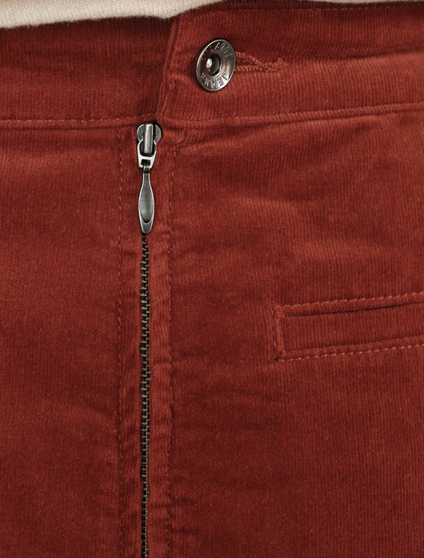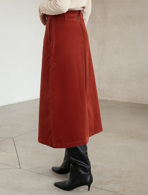 Юбка-миди трапециевидного силуэта выполнена из мягкого хлопкового микро-вельвета с добавлением эластана. Изделие комфортно садится по фигуре и не сковывает движения. Модель дополнена высококачественной фурнитурой с фирменным логотипом бренда. Хорошо комбинируется с вязаным трикотажем, блузками и денимом.Также прекрасно станет альтернативой деловым низам в нестрогом офисном дресс-коде.