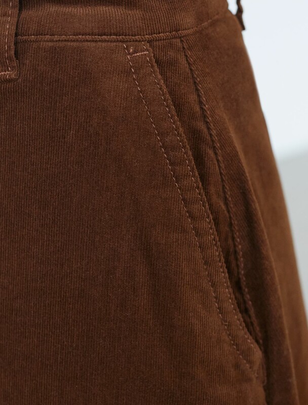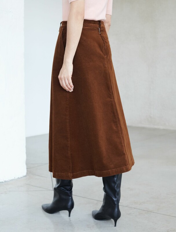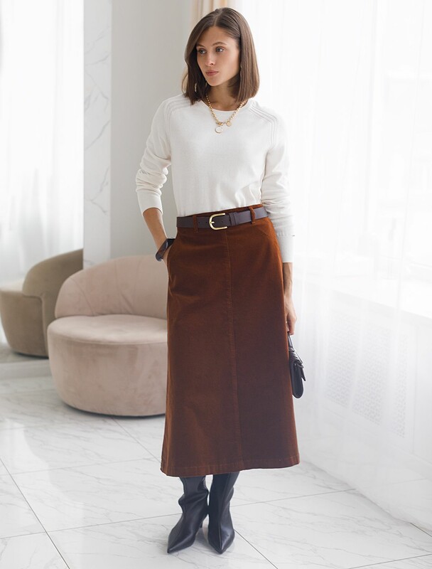 Производитель: Vilatte Юбка-миди трапециевидного силуэта  выполнена из мягкого хлопкового микро-вельвета с добавлением эластана. Изделие комфортно садится по фигуре и не сковывает движения. Модель дополнена высококачественной фурнитурой с фирменным логотипом бренда. Хорошо комбинируется с вязаным трикотажем, блузками и денимом.Также прекрасно станет альтернативой деловым низам  в нестрогом офисном дресс-коде.