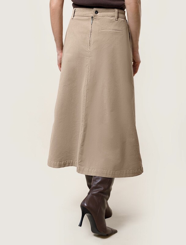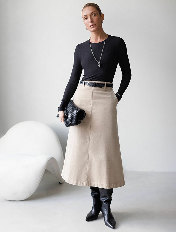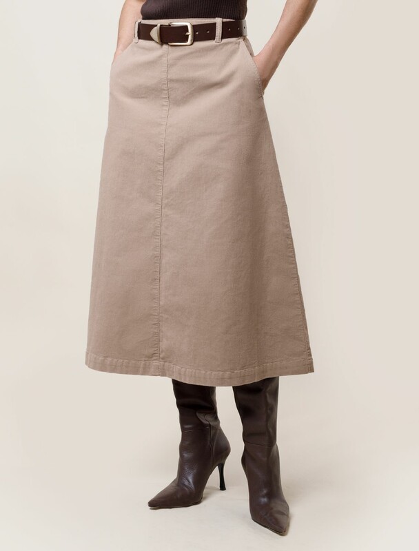 Производитель: Vilatte Юбка-миди трапециевидного силуэта  выполнена из мягкого хлопкового микро-вельвета с добавлением эластана. Изделие комфортно садится по фигуре и не сковывает движения. Модель дополнена высококачественной фурнитурой с фирменным логотипом бренда. Хорошо комбинируется с вязаным трикотажем, блузками и денимом.Также прекрасно станет альтернативой деловым низам  в нестрогом офисном дресс-коде.