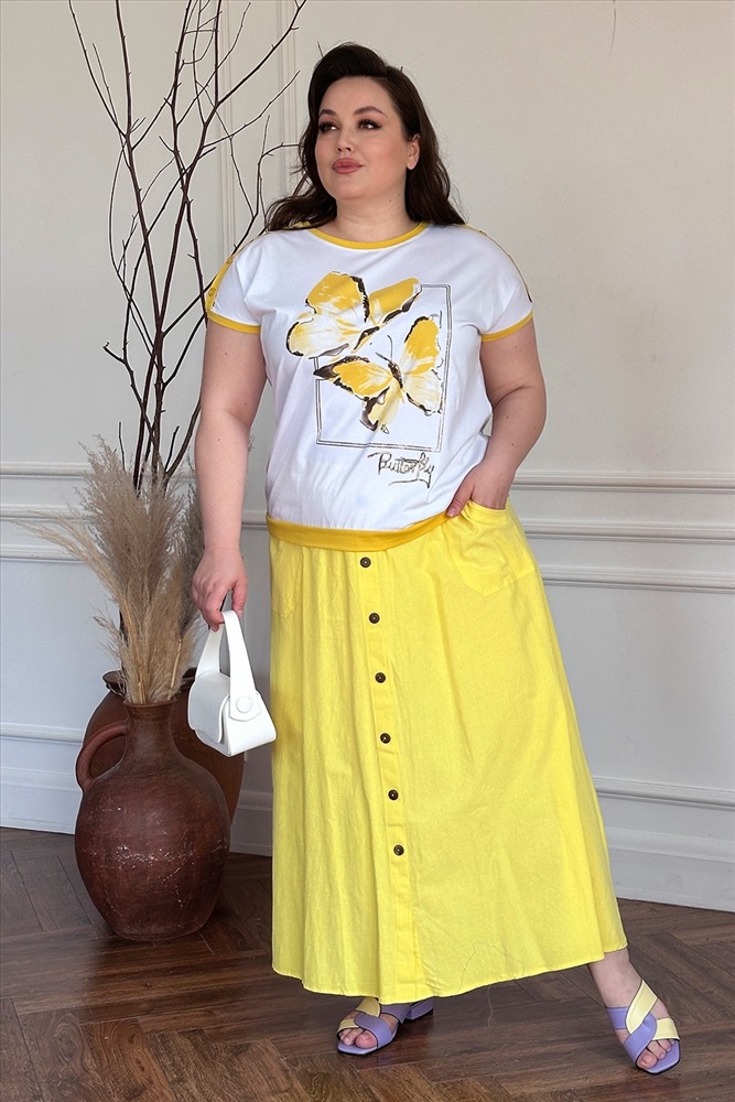 Видео: https-//rutube.ru/embed/5444a61f4c039770350e7a14f588b326/ Цвет: Желтый Фасон: Юбка Длина платья: Французская длина Материал: Хлопок Параметры модели: Рост 168 см, Размер 54 Параметр- Материал: Хлопок Параметр- Цвет: Желтый Параметр- Параметры модели: Рост 168 см, Размер 54 Юбка жатая с пуговками желтая Стильная юбка из мягкой ткани подчеркнет достоинства женской фигуры. Широкий притачная резинка по поясу способствует оптимальной посадке по фигуре. Расклешенные клинья модели искусно обыгрывают бедра и добавляют образу женственности и романтизма. По бокам практичные карманы. Декоративные пуговки по переду добавляют модели нарядности и освежают образ.  Носить юбку такого плана можно с любимыми футболками, обтягивающими водолазками, блузами и рубашками. Длина изделия 50 размера по спинке - 92 см. В каждом следующем размере длина увеличивается.