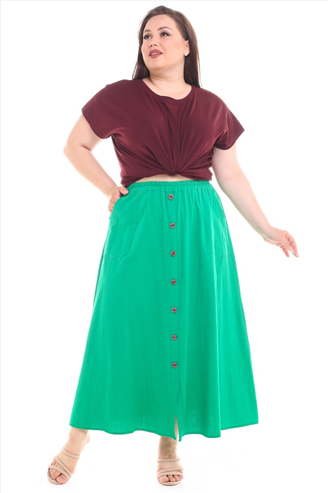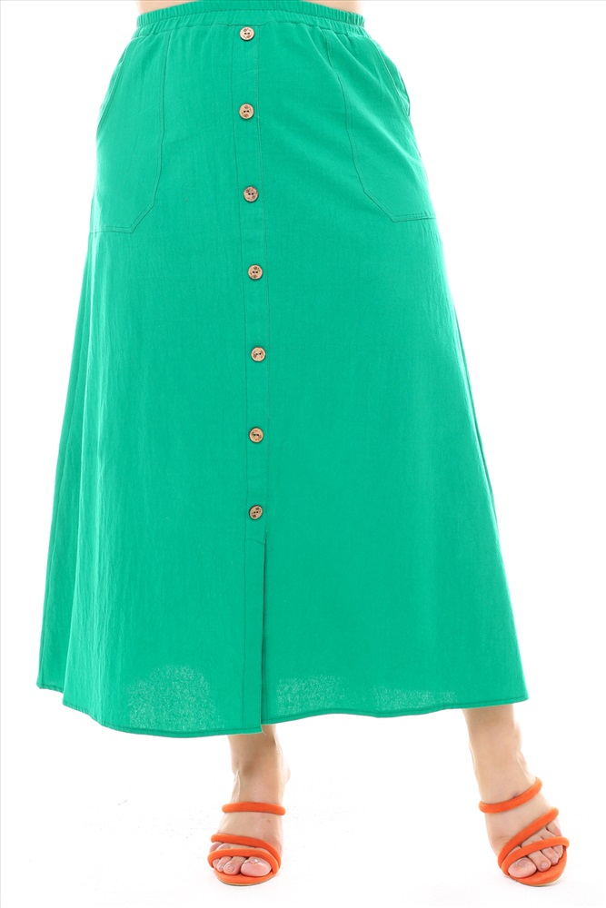Стильная юбка из мягкой ткани подчеркнет достоинства женской фигуры. Широкий притачная резинка по поясу способствует оптимальной посадке по фигуре. Расклешенные клинья модели искусно обыгрывают бедра и добавляют образу женственности и романтизма. По бокам практичные карманы. Декоративные пуговки по переду добавляют модели нарядности и освежают образ. Носить юбку такого плана можно с любимыми футболками, обтягивающими водолазками, блузами и рубашками.