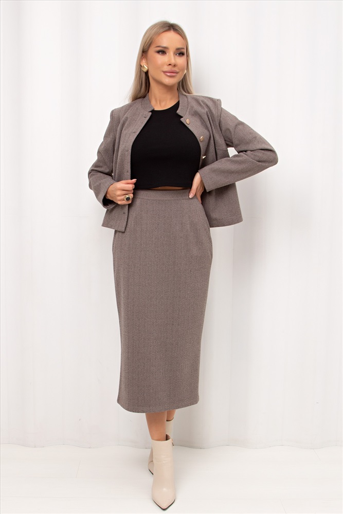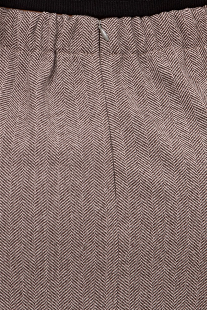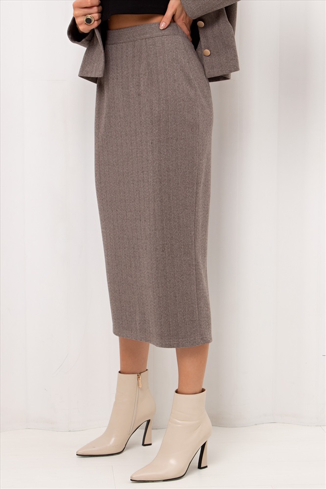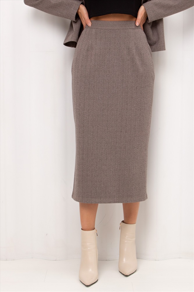 Юбка - карандаш прямого силуэта из утепленного костюмного трикотажа в «ёлочка». Модель с комфортной посадкой по талии, которую обеспечивает резинка по спинке. По среднему шву спинки застежка на потайную молнию. Низ ровный, сзади разрез.