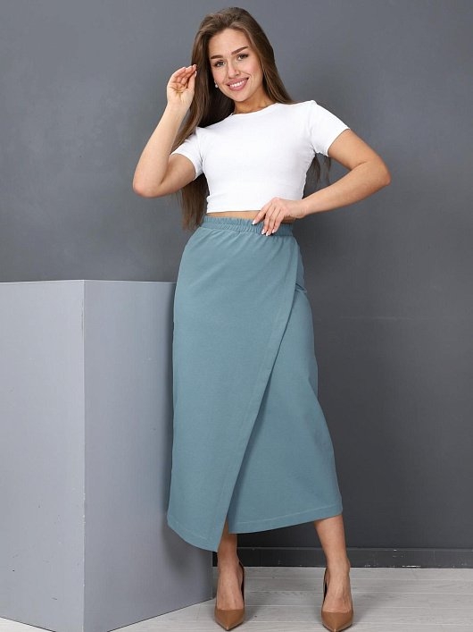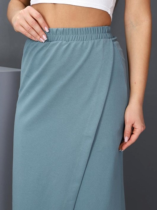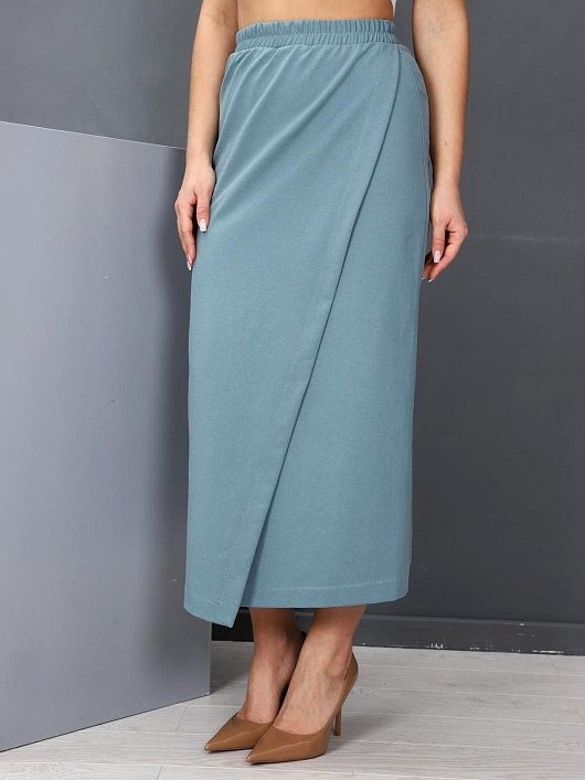 Юбка из футера 2нитки прямого силуэта, на запах. Пояс на резинке. Низ изделия обработан швом вподгибку. Длина изделия - миди.