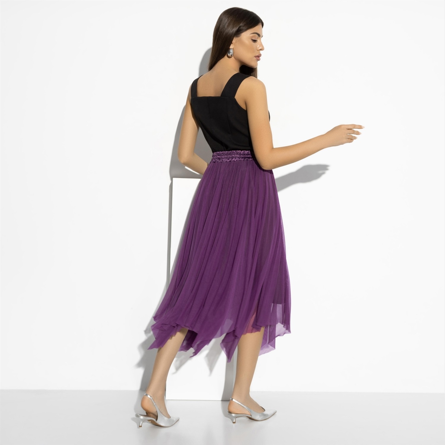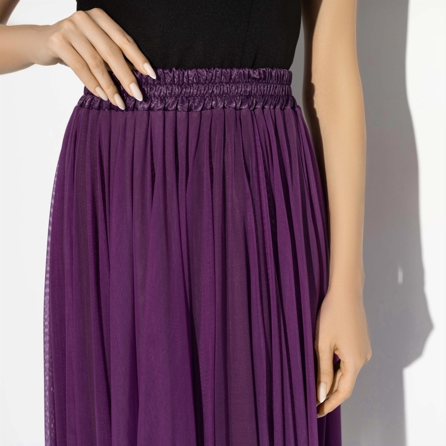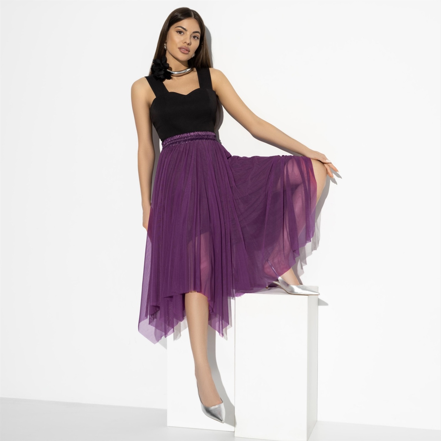 Состав: «Сетка стрейч», трикотаж «вискоза», «сатин креш» (65% п/э, 30% вискоза, 5% спандекс) Плотность ткани: Тонкая Тип ткани: Трикотаж Вид застежки: Нет Декоративные элементы: Драпировка Карманы: Нет Основной цвет ткани: Фиолетовый Отрезная талия: Есть Подклад: Есть Резинка по талии: Есть Рисунок/раппорт: Нет, все изделия идентичны Сезон: Круглогодичный Силуэт: Свободный Стиль: Вечерний Фасон юбки: Пачка Фасон юбки: Пачка Параметры модели на фото:
