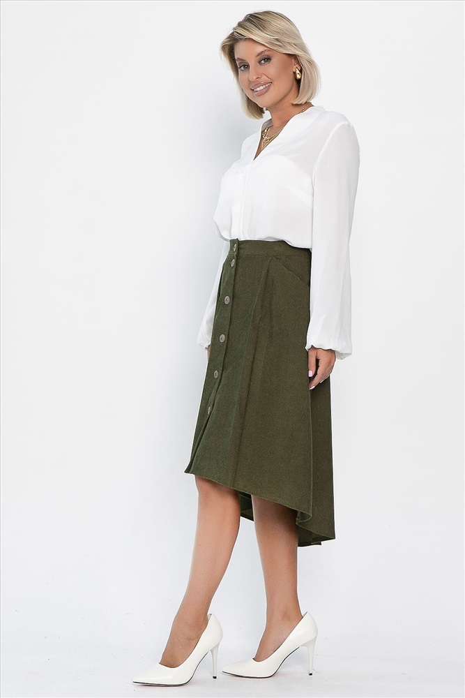 Вельветовая юбка в оттенке хаки длиной миди — это то, что подчеркнет вашу фигуру и добавит стильного шарма вашему образу! Благодаря своему трендовому силуэту и трапециевидной форме, она станет идеальным вариантом для деловых встреч, вечеринок или прогулок по городу.