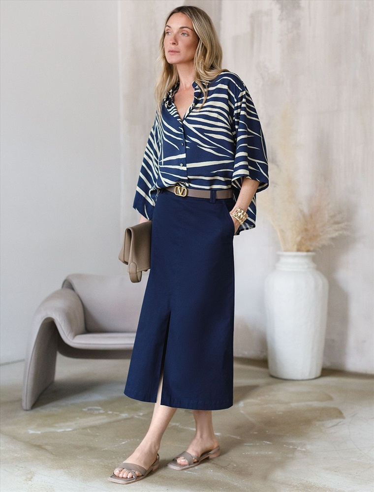 Женская юбка длины миди А-силуэта выполнена из хлопокового твила. Изделие дополнено разрезом спереди и боковыми карманами. Застежка на молнии сбоку. Отличный вариант для любого сезона, как для офисного стиля, так и для повседневного гардероба. Натуральный материал ткани обеспечивает высокий уровень комфорта, отличную гигроскопичность и воздухопроницаемость. Эластан в составе изделия минимизрует деформацию модели и продлевает срок носки.