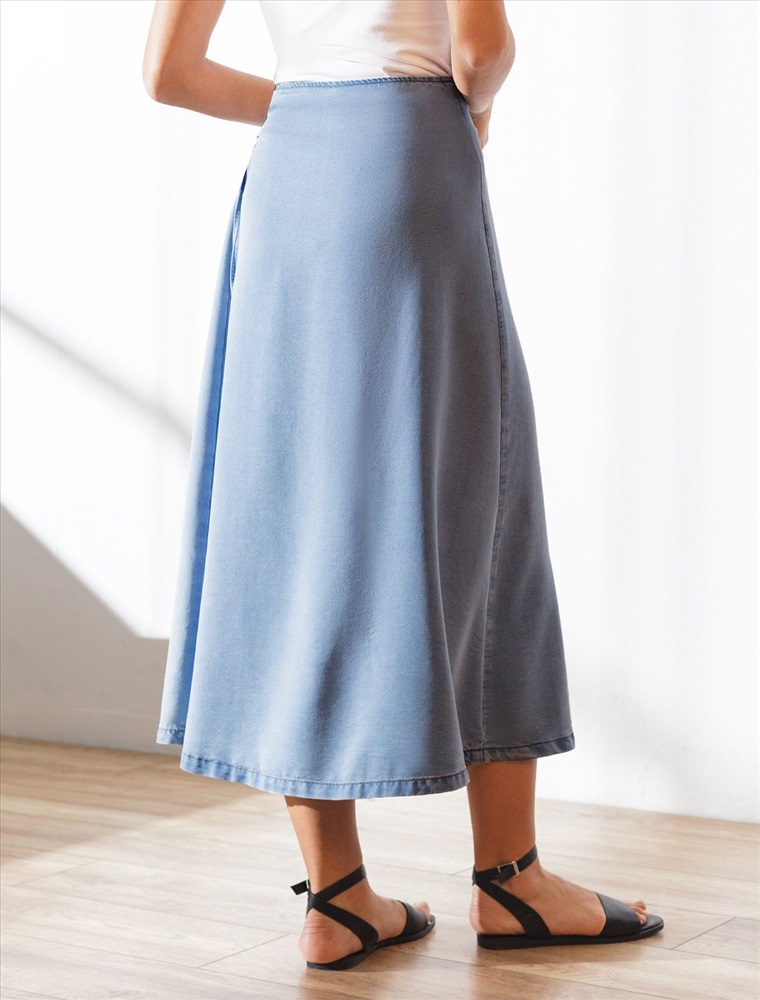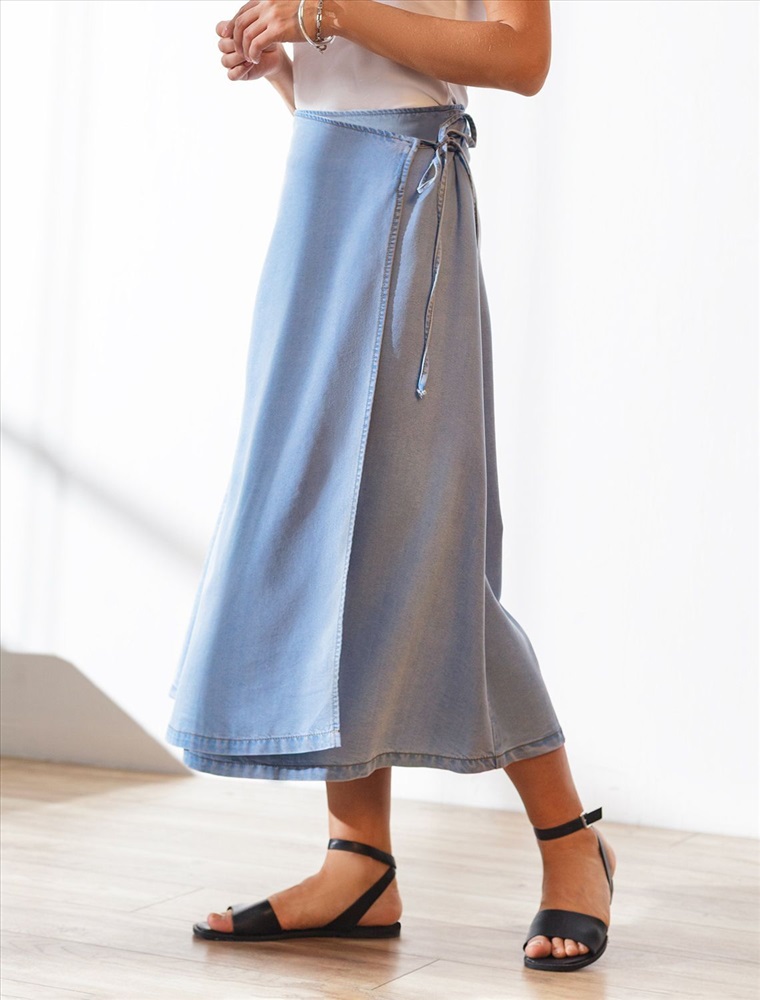 Эффектная юбка миди на запах А-силуэта светло-голубого цвета из джинсового лиоцелла плотностью 7,8 OZ станет отличным выбором для тех, кто ценит комфорт и легкость в повседневной одежде. Свободный крой юбки мягко скроет недостатки фигуры, акцентируя внимание на достоинствах и придавая силуэту привлекательность и женственность. ЗапАх гарантирует удобство и возможность регулировки объема талии, а также добавляет современный акцент. Легкая и удобная, она подарит ощущение свободы движений. Ткань сочетает прочность и мягкость лиоцелла с вискозой, что делает её невероятно комфортной, дышащей, устойчивой к сминанию и идеально подходящей для чувствительной кожи. Юбка отлично подходит для создания легких летних образов или стильных ансамблей на каждый день. Джинсовую юбку можно сочетать в стиле кэжуал, а также создавать романтичные образы или добавлять яркие акценты с помощью аксессуаров. Юбка средней длины гармонично сочетается с разной обувью и верхом, что делает ее отличным выбором для любого случая.