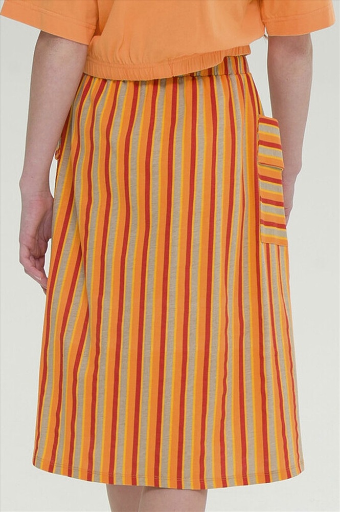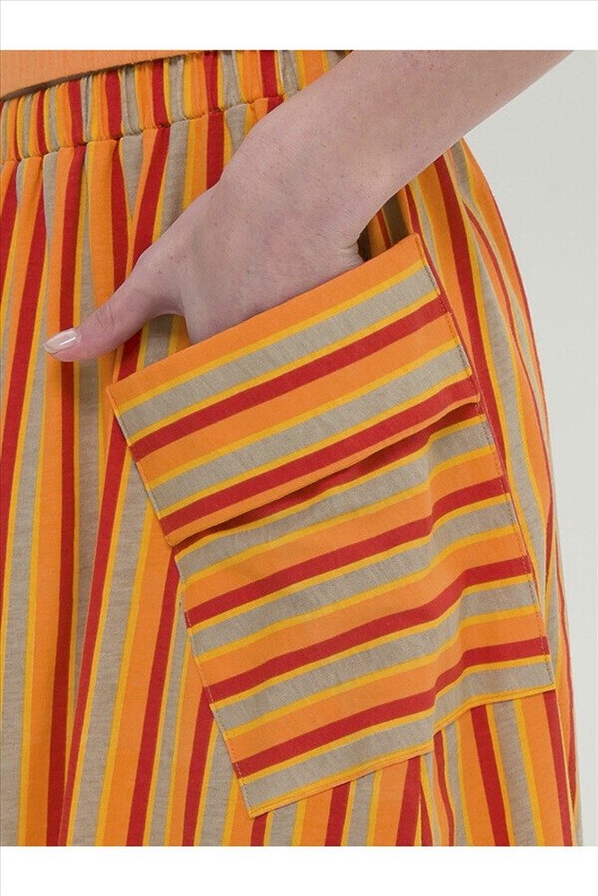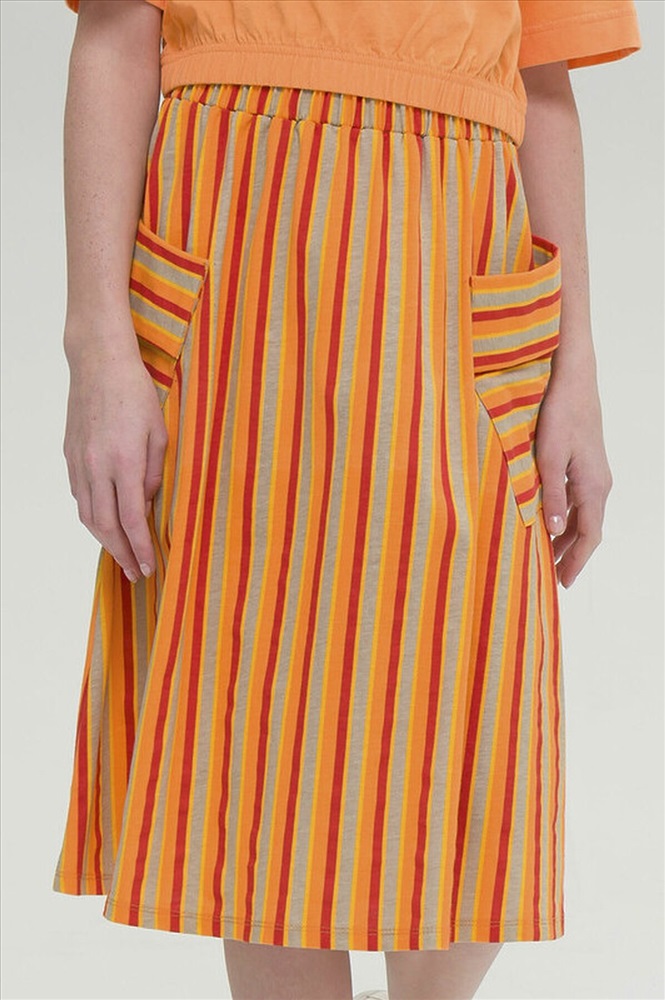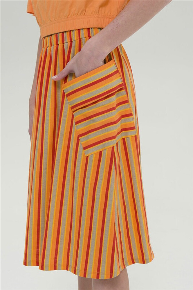 Модная трикотажная юбка для девочки на резинке - это практичный вариант на каждый день. Выполнена из воздушного хлопкового трикотажа принтованного в полоску - идеальна для жаркой погоды. Юбка, слегка расклешенная книзу, длиной до середины икры. По бокам два больших накладных наклонных кармана с клапанами привлекают внимание и делают юбку самой актуальной в этом сезоне. Широкая резинка не давит, не натирает - удобно и комфортно в течение всего дня. Легкая повседневная юбка займет достойное место в гардеробе девочки, подойдет как для ежедневной носки, так и для особых случаев.
