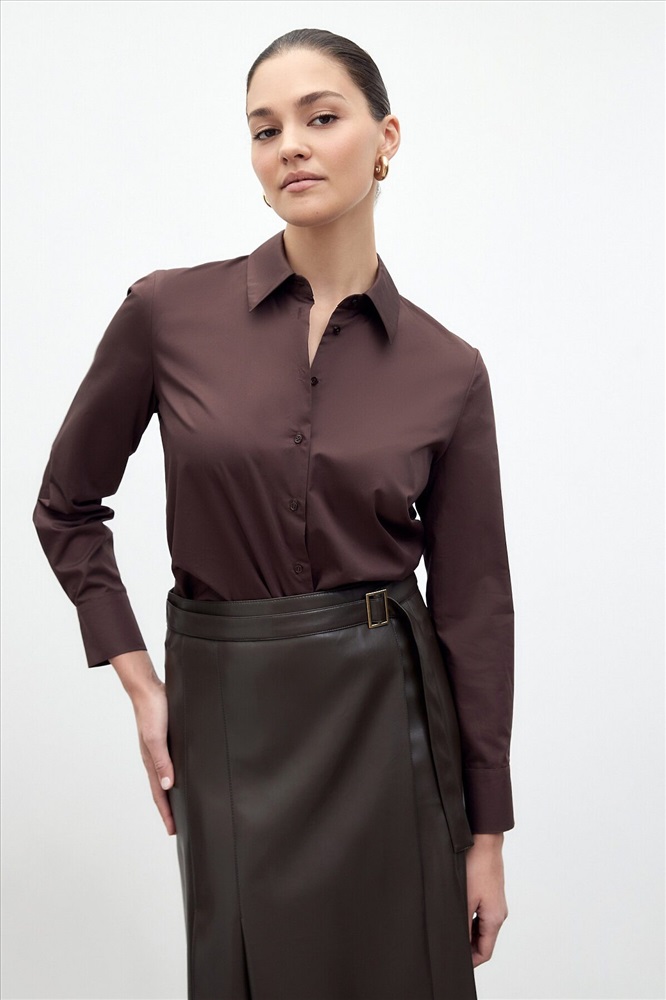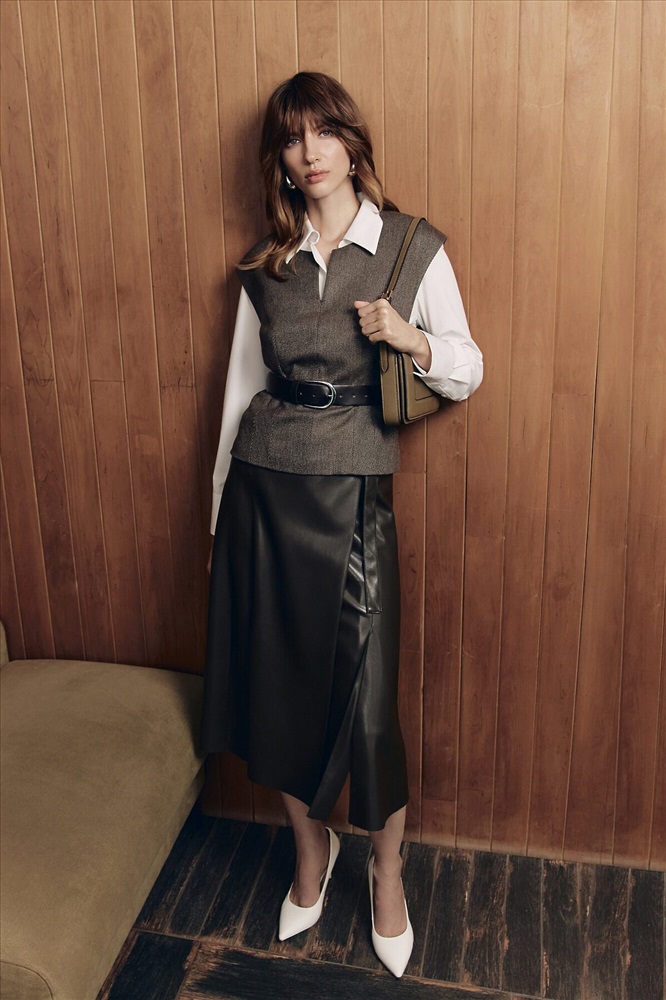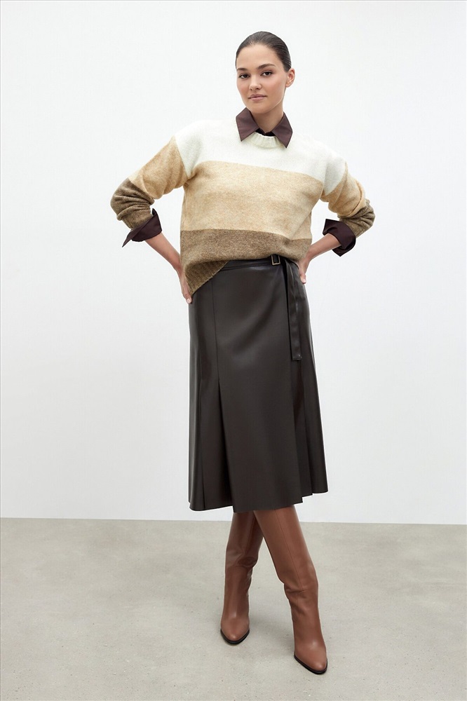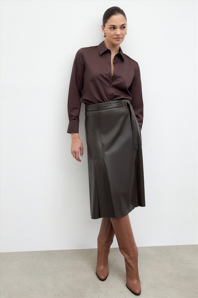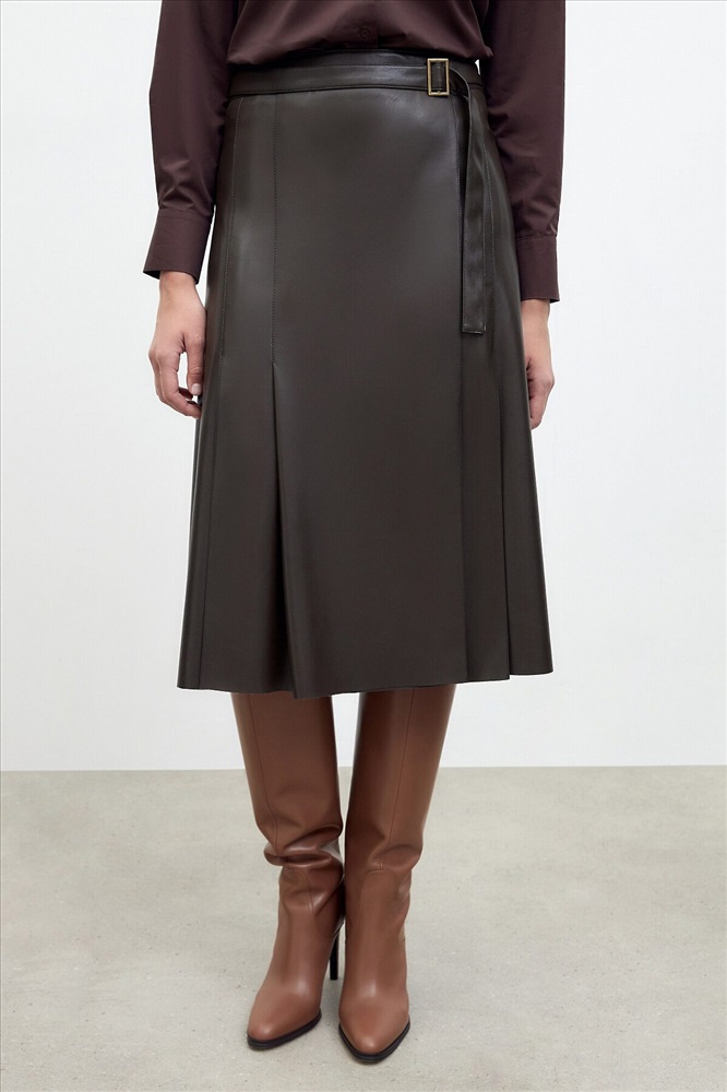 Юбка трапеция со складками по переду на притачном поясе и поясе из боковых швов с небольшой металлической пряжкой. Потайная застежка молния на спинке. Пояс и складки отстрочены. Юбка на подкладке.