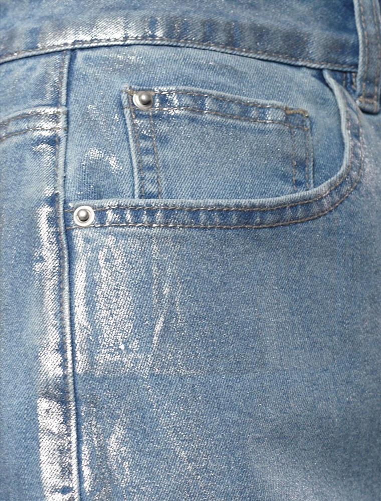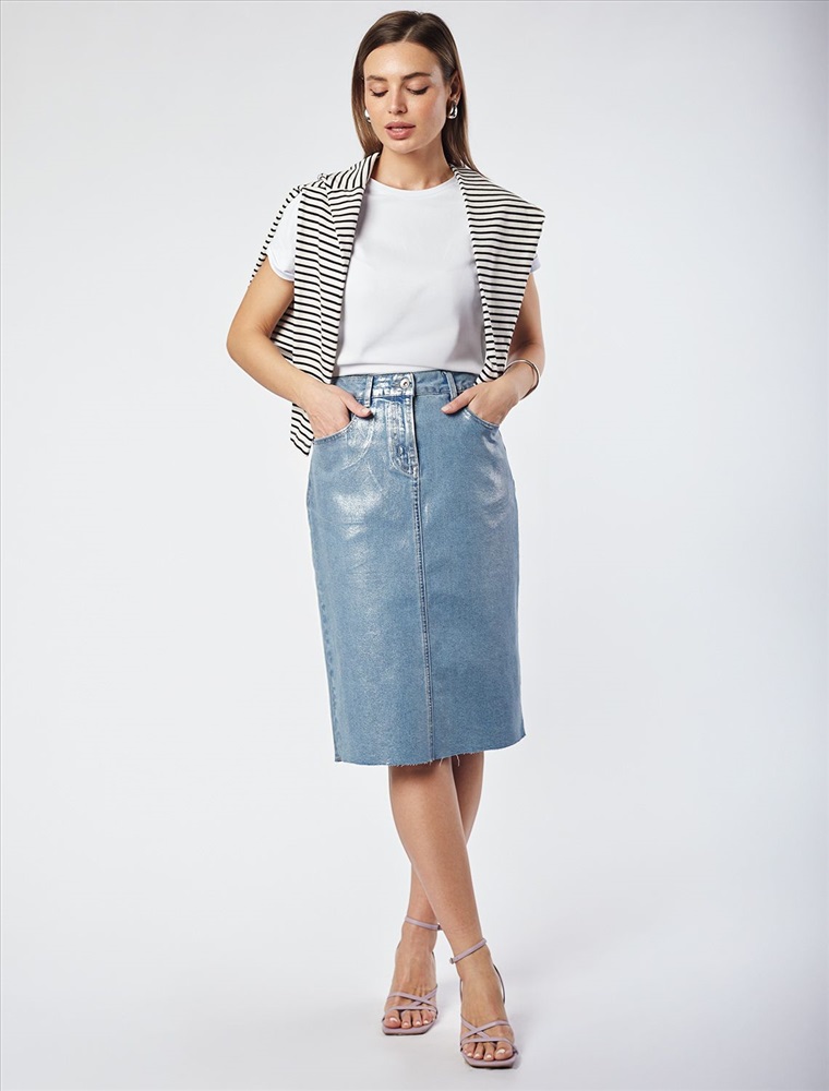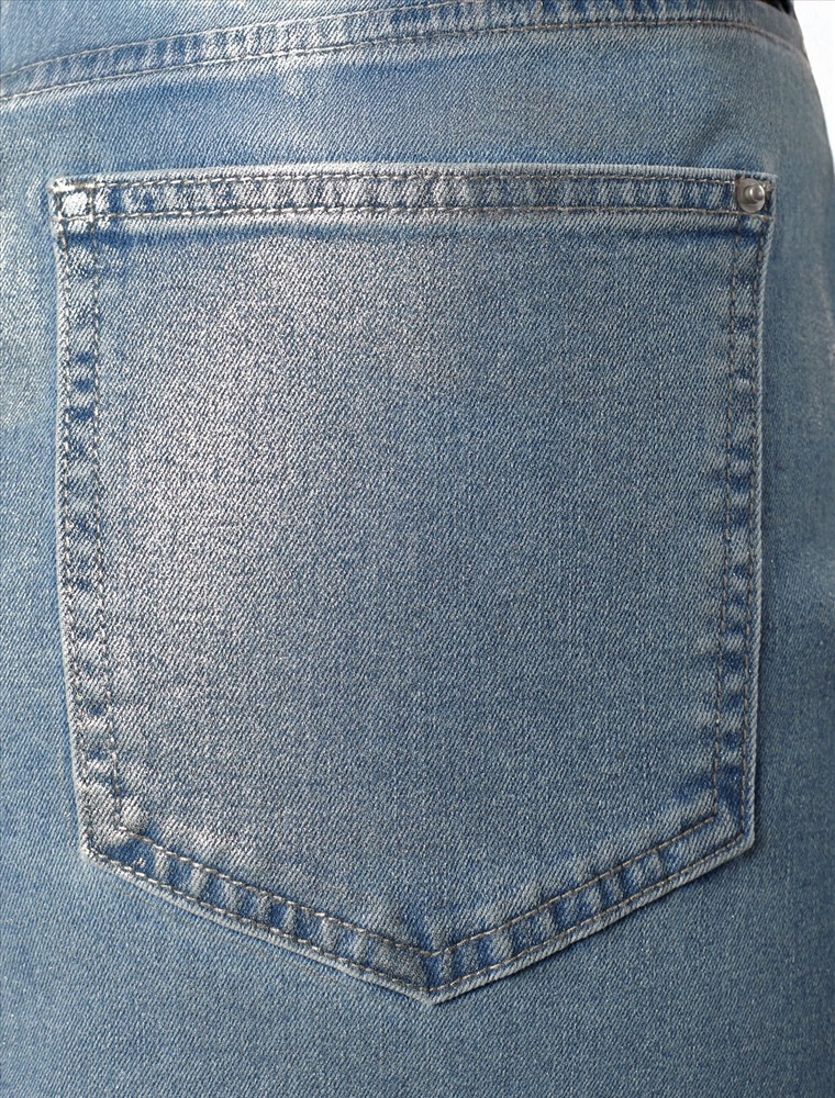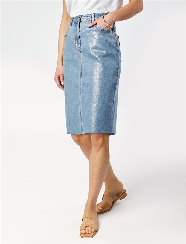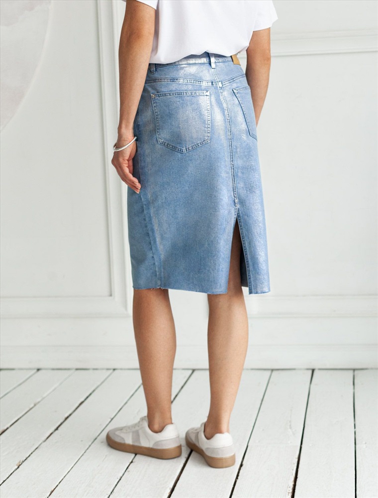 Юбка выполнена из эластичного денима. Сверху изделия нанесено стойкое, но при этом мягкое металлизированное покрытие с декоративными потёртостями. Модель прямого кроя чуть ниже колен с трендовым открытым срезом и пятью карманами как у джинс внесет яркий акцент любому образу.