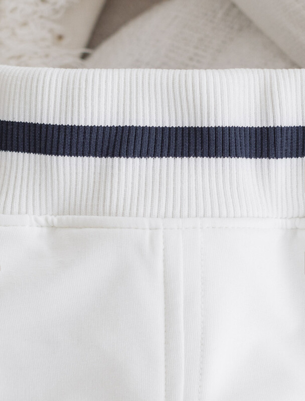 Юбка-шорты выполнена из эластичного футера двухнитки. В боковых швах расположены карманы. Внутренняя часть кармана из тонкого хлопка в тон полотна. Модель дополнена эластичным поясом, с контрастной полосой и золотистым логотипом бренда. Сочетается в костюме с джемпером D49.083 и D49.086