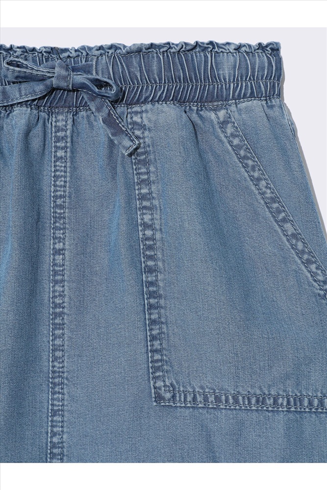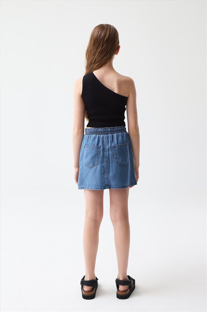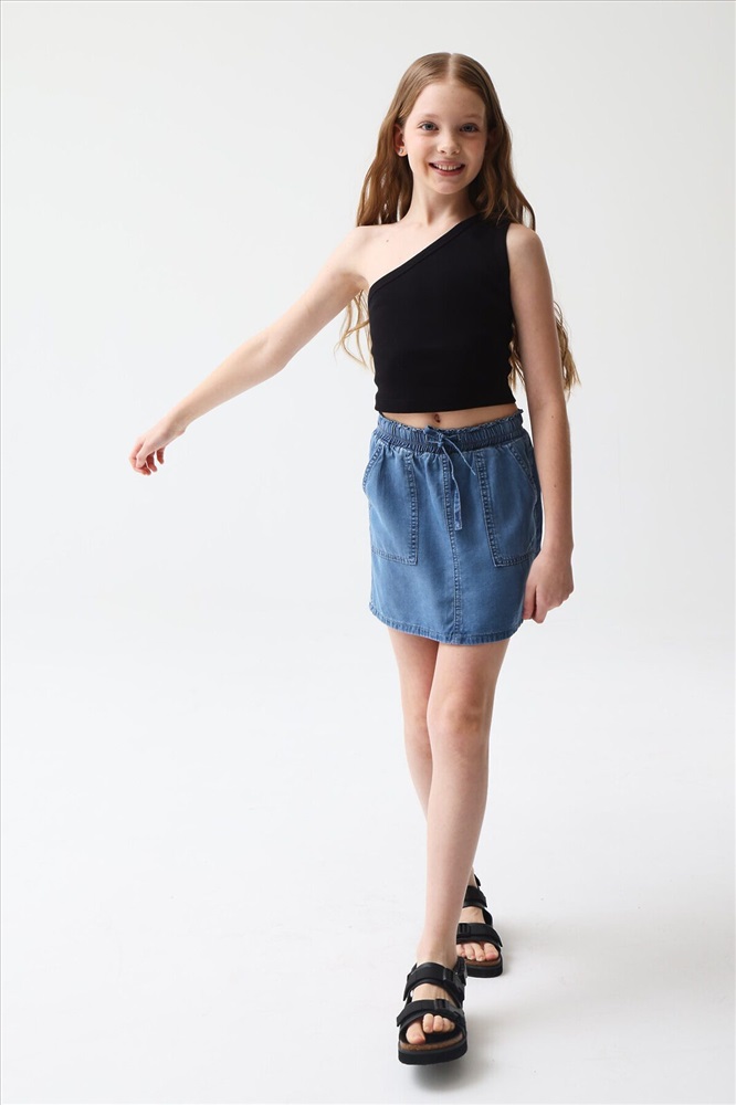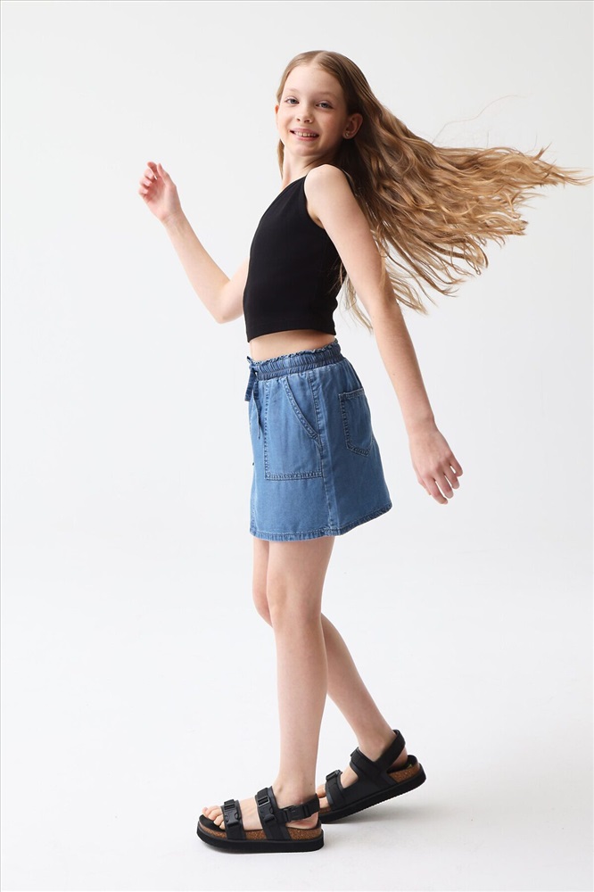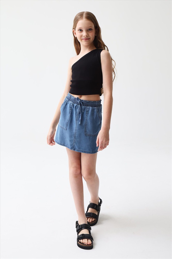 Юбка из лиоцелла прямого кроя. Средняя посадка с широким поясом на резинке. По поясу расположен рулик в качестве завязки, что добавляет комфорта в носке. Крупные накладные передние карманы и задние классические. Размерный ряд 128 – 176 см.