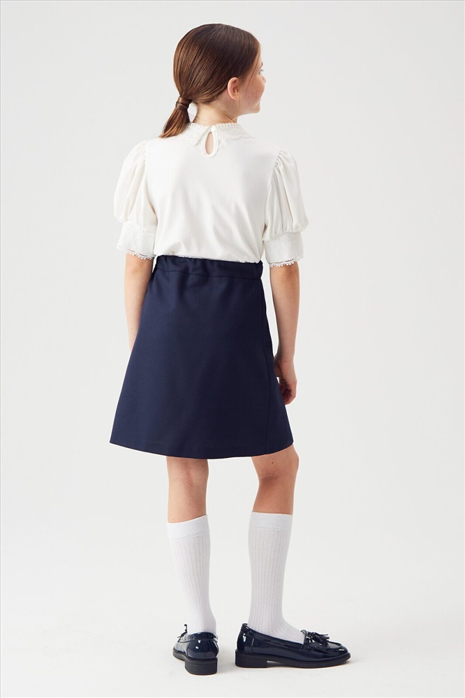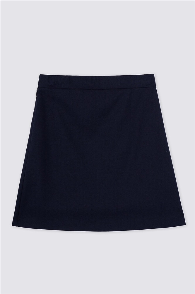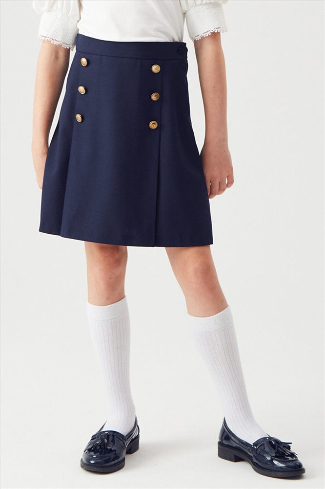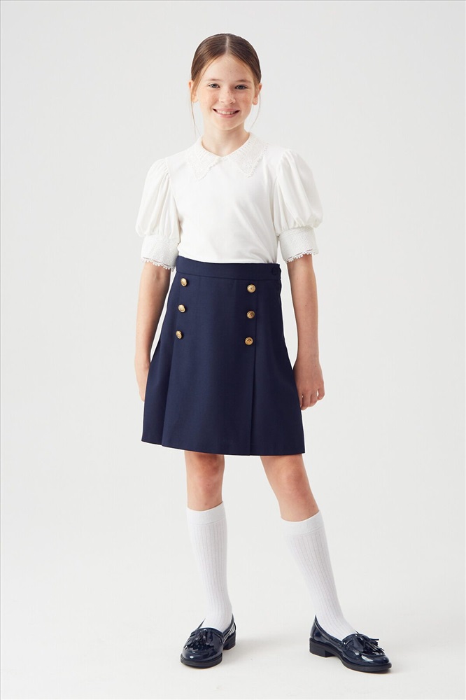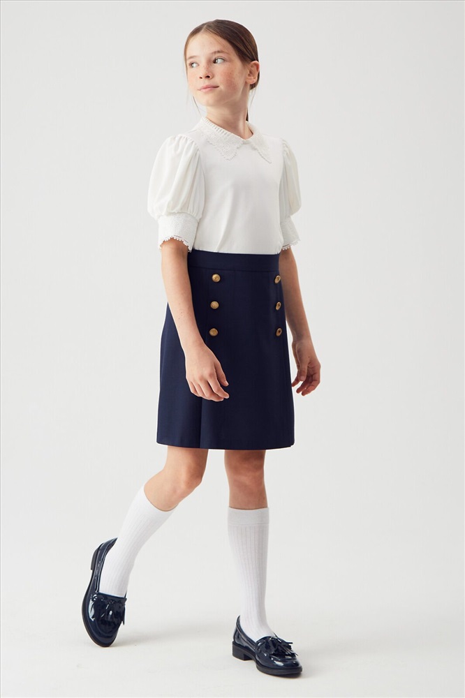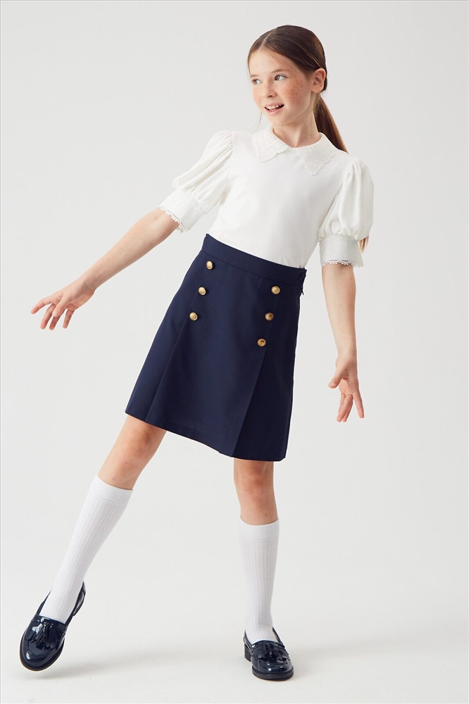 Элегантная школьная юбка для девочек, созданная специально для комфортного и стильного образа. Изделие из качественной ткани идеально подходит для учебных будней. Легкая расклешенная форма создает изящный силуэт и обеспечивает свободу движений. Застежка в левом боковом шве выполнена на потайную тесьму-молнию, что делает ее незаметной и удобной. Также предусмотрена одна обметанная петля с пуговицей на поясе для дополнительной фиксации. На передней части изделия симметрично расположены шесть декоративных пуговиц на ножке, которые добавляют акцент к строгому дизайну. Складки возле швов стачивания гармонично дополняют общий вид, делая модель универсальной как для официальных мероприятий, так и повседневной носки в школе.