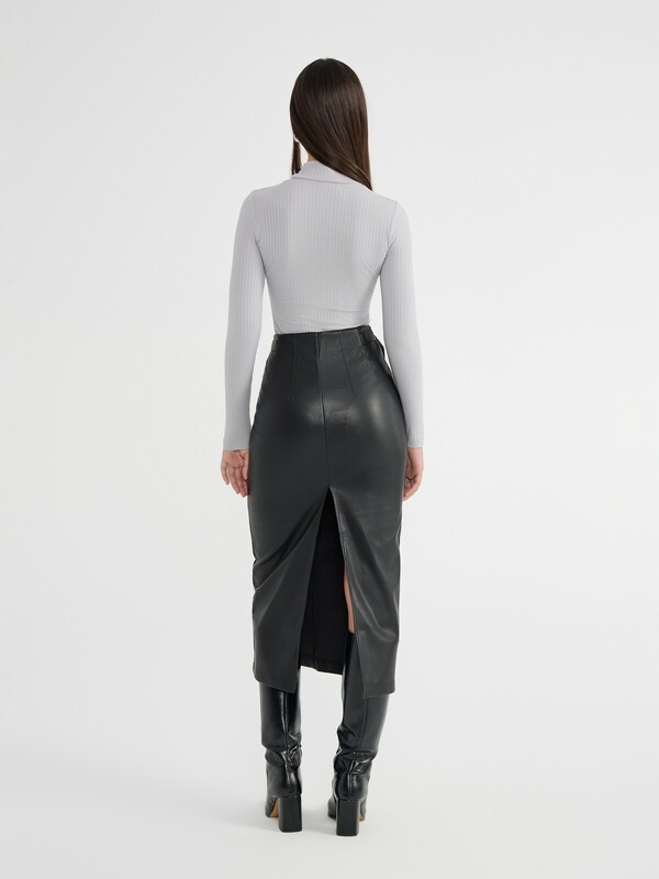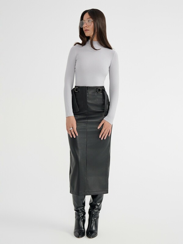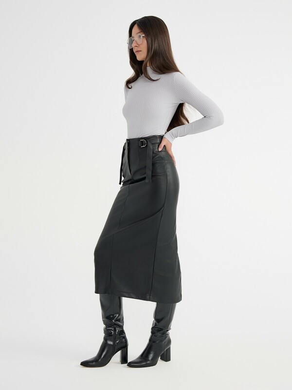"Юбка-midi из экокожи прилегающего кроя с декоративными патами по бокам идеально подойдет для создания стильного осеннего аутфита. Модель легко дополнит ваш деловой образ, а также станет прекрасным вариантом для вечернего выхода в свет.