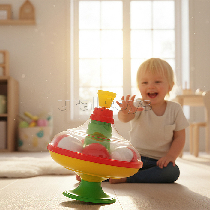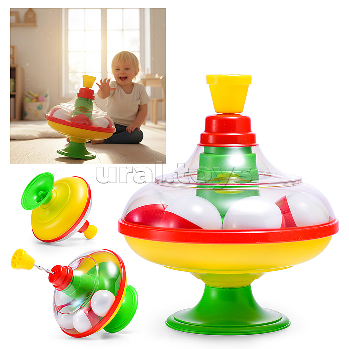 • Детям нравится наблюдать за вращением юлы, особенно их привлекает прозрачный купол. Малыши готовы снова и снова запускать юлу, чтобы смотреть, как под ним прыгают и гремят шарики. • Игрушка развивает сенсорную сферу, мелкую моторику, формирует зрительно-моторную и зрительно-слуховую координацию. Знакомит со свойствами движущегося предмета. • Юла раскручивается плавным движением, без отрыва от поверхности, после 2-3 нажатий ручку необходимо отпустить. • Внутри игрушки 6 шариков диаметром 3.5 см., создающих шумовой эффект. • Устойчивое основание диаметром 8 см. • Размеры изделия: 14х14х14 см. • Материал: полистирол. • Упаковка: сетка. • Соответствует требованиям безопасности и стандартам качества продукции. • Для детей от 3-х лет.