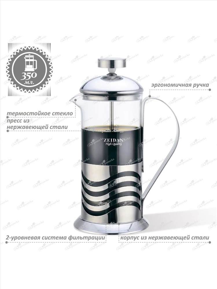 Выбирая заварочник для чая или кофе, важно обратить внимание на его достоинства и внешний вид. Наш френч пресс является идеальным выбором для тех, кто ценит настоящий вкус напитков. Френч-пресс стеклянный 350 мл для чая и кофе. Френч-пресс 350 мл заварочный ZEIDAN предназначен для заваривания чая, приготовления кофе и других напитков. Съемная колба изготовлена из жаропрочного стекла и имеет практичный носик, что препятствует образованию подтеков и делает френч-пресс еще более удобным в обращении. Благодаря специальному поршню с встроенным фильтром, изготовленным из нержавеющей стали, напиток получается чистым и прозрачным. Эргономичная ручка заварника делает использование френч-пресса удобным и безопасным. Заварник с прессом имеет дополнительный фильтр на крышке для лучшей фильтрации. Стеклянный чайник для заварки изготовлен из экологичных и прочных материалов, не выделяет вредных веществ под воздействием кипятка, а заварной кофе или чай будут каждый раз радовать своими неповторимыми вкусами вас, вашу семью и гостей. Заварочный френч-пресс обязательно пригодится на кухне, а также френч-пресс 350 мл станет замечательным подарком для родственников, друзей, родителей и коллег на День Рождения, 8 Марта, 14 февраля, просто так. Декоративная посуда поставляется в красивой подарочной коробке. Порадуйте себя и своих близких самым популярным подарком-френч-пресс для чая. В нашем магазине вы найдете много посуды для кухни: это предметы дизайна, на которые приятно смотреть и которыми приятно пользоваться. Здесь Вы найдете все необходимое, и даже больше, для Вашей кухни дачи, офиса, дома. Центральное место ассортименте посуды принадлежит заварочным чайникам из стекла жаропрочного, а также чайникам для кипячения воды из огнеупорного стекла. Правильно подобранный заварной чайник позволит максимально раскрыться вкусовым, визуальным и ароматным качествам того или иного чайного напитка. Подписывайтесь и следите за нашими новинками и акциями!