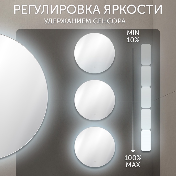 Габариты: 68 x 58 x 7 Доставка: Платная Страна: Россия В боксе: 1 шт Состав: Зеркало, пластик Материалы: зеркало, пластик Фасовка: по 1 шт Индивидуальная упаковка: Картонная коробка Сертификат: Не подлежит сертификации Форма: Прямоугольная Ширина, мм: 600 Высота, мм: 500 Подсветка: Да Особенность зеркала: Сенсорное управление Влагостойкость: Да Материал зеркала: Стекло Зеркало интерьерное настенное «Рубин» С LED – подсветкой оснащено сенсорным переключателем и тремя режимами света: теплым, холодным и нейтральным. Яркость регулируется удержанием сенсора от 10% до 100%, что позволяет создавать комфортное освещение в любой обстановке. Преимущества