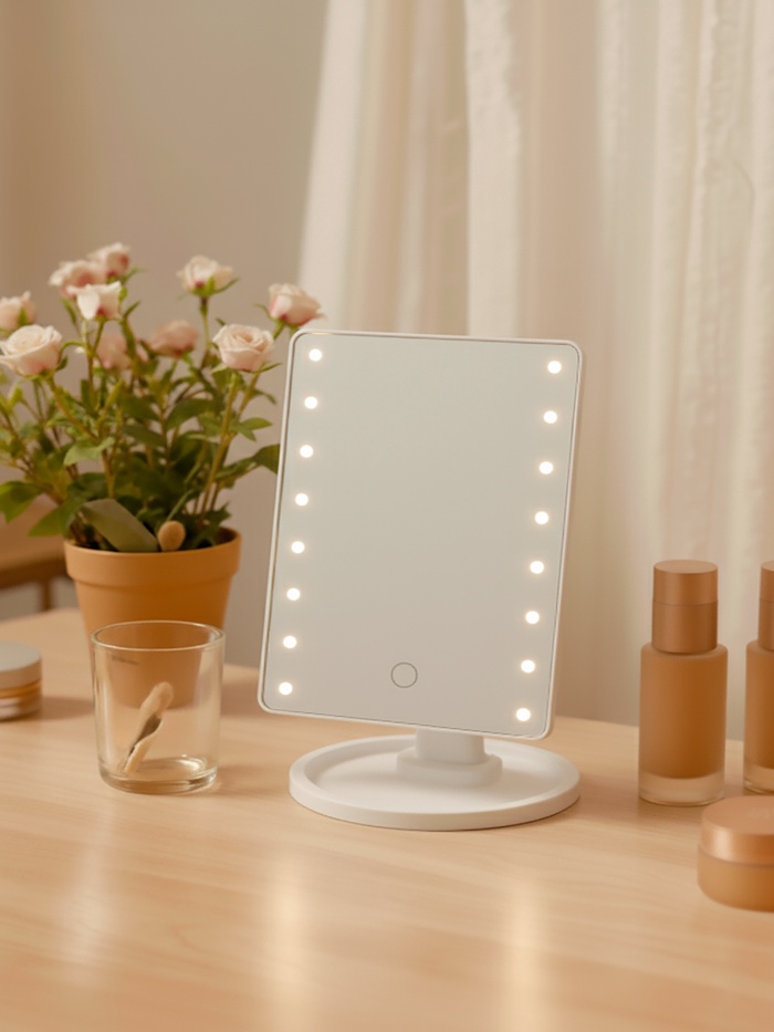 Материал корпуса — пластик, а форма — прямоугольная с устойчивой подставкой, что обеспечивает стабильное размещение на столе или туалетном столике. Это решение создано с вниманием к удобству: достаточно лёгкого касания сенсора, чтобы активировать мягкий свет и обеспечить идеальную видимость.