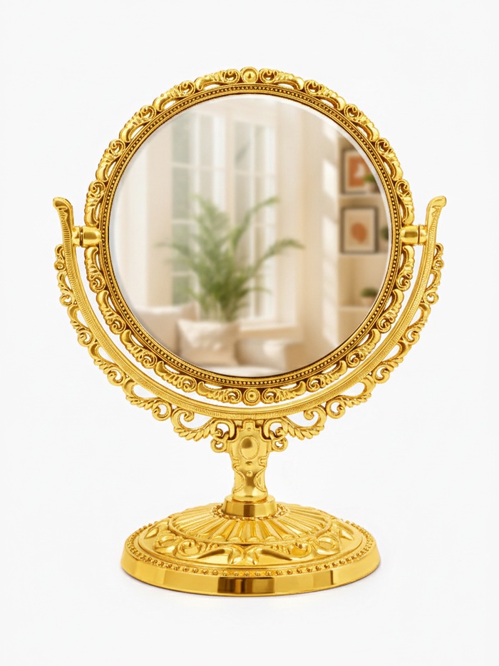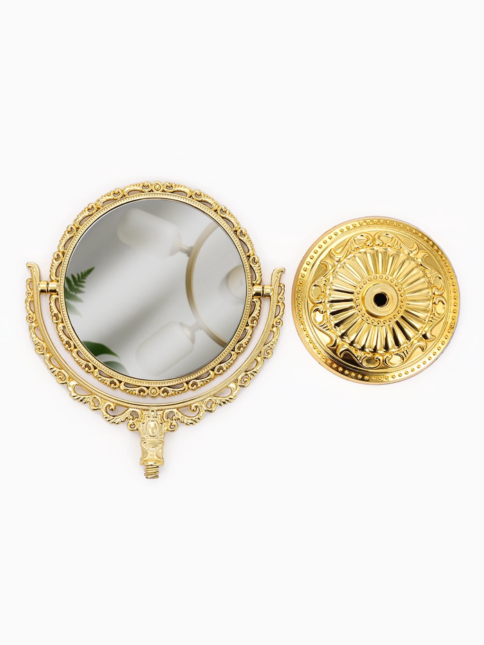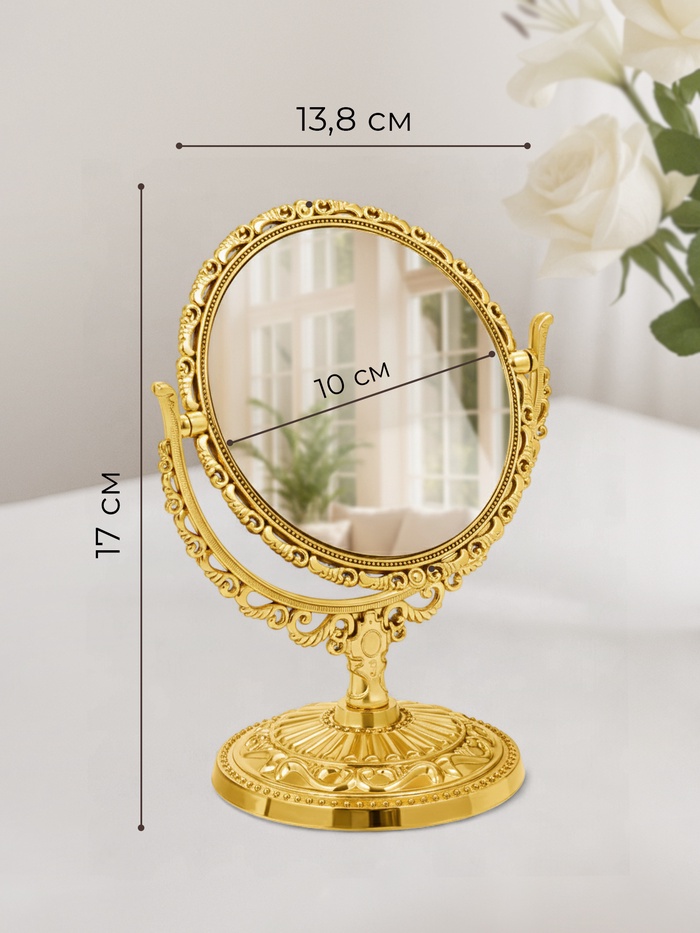 Изящное зеркало на ножке — украшение для туалетного столика. Конструкция не расшатывается и устойчиво держится на поверхности. Увеличивающая линза пригодится, чтобы рассмотреть детали макияжа.