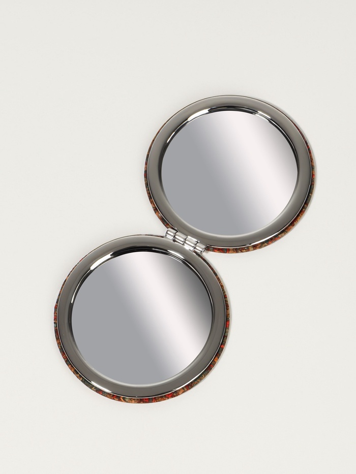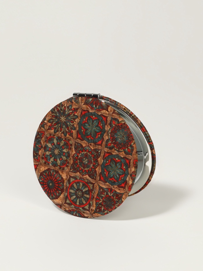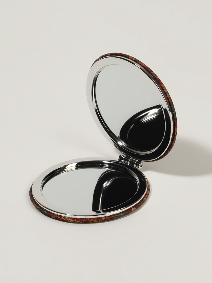 Функциональность и стиль Двойное зеркало помогает выявлять мелкие нюансы внешнего вида, повышая качество ухода и макияжа. Складной механизм сохраняет зеркало в целости, позволяя носить его в сумочке без риска повреждений. Тёплая цветовая гамма и орнаментальный узор делают аксессуар не только практичным, но и визуально привлекательным элементом повседневного образа. ДополнительноКомментарии к товару