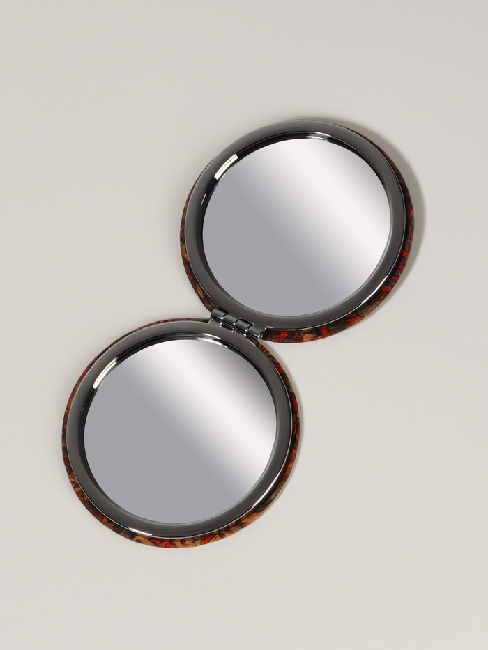 Компактное складное зеркало с орнаментальным дизайном в тёплом коричневом оттенке станет удобным спутником в повседневном уходе за внешностью. Благодаря двум зеркальным поверхностям — стандартной и с увеличением в 2 раза — оно помогает внимательно рассмотреть мелкие детали, будь то макияж или укладка волос. Круглая форма и металлический корпус обеспечивают надёжность и комфорт при использовании, а складной механизм защищает зеркала от повреждений и загрязнений при переноске.