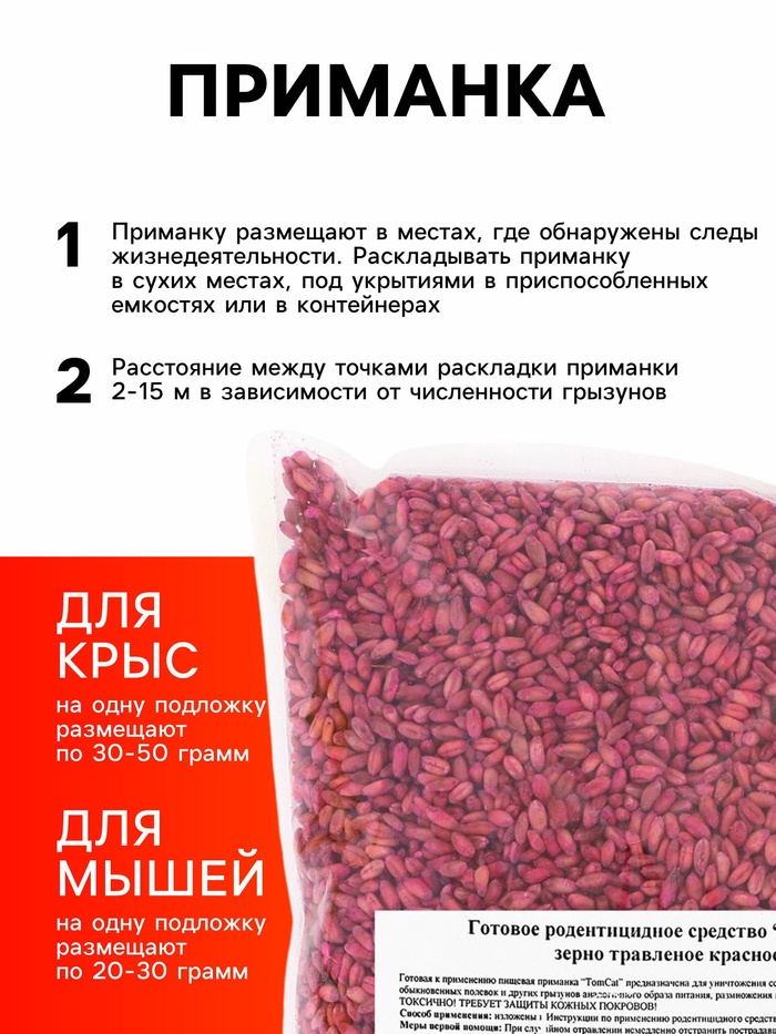 Как использовать Применение средства предельно просто: распределите зерно в местах скопления грызунов или вдоль их путей. Избегайте контакта с пищевыми продуктами и следуйте инструкции на упаковке для достижения максимальных результатов. Не откладывайте борьбу с вредителями, средство на основе зёрен обеспечит вам спокойствие и безопасность в собственном доме! Комментарии к товару