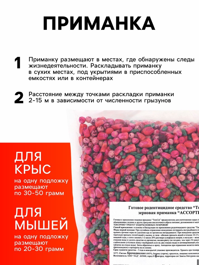 Приманка используется в местах, где часто встречаются грызуны: у стен, в темных углах или под мебелью. Расположите продукт так, чтобы он был недоступен для детей и домашних животных.
