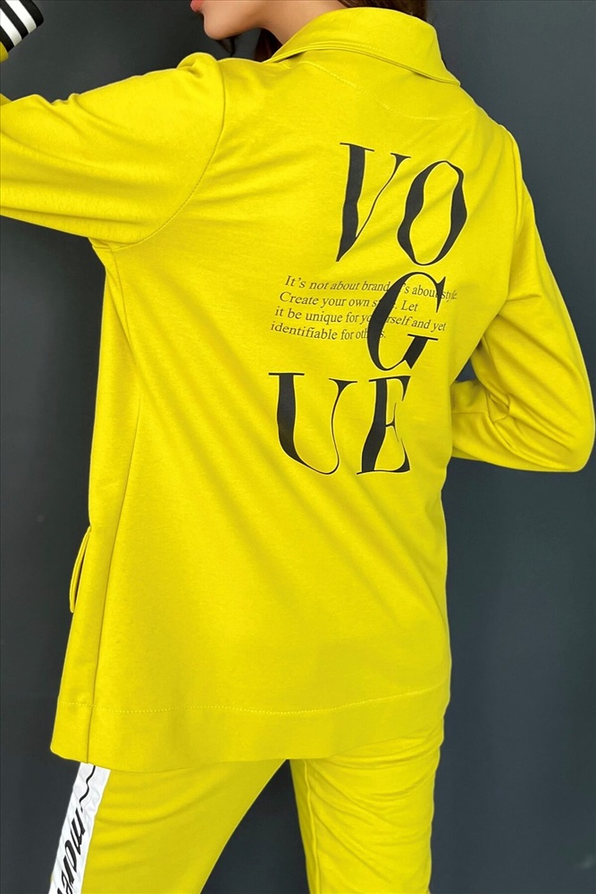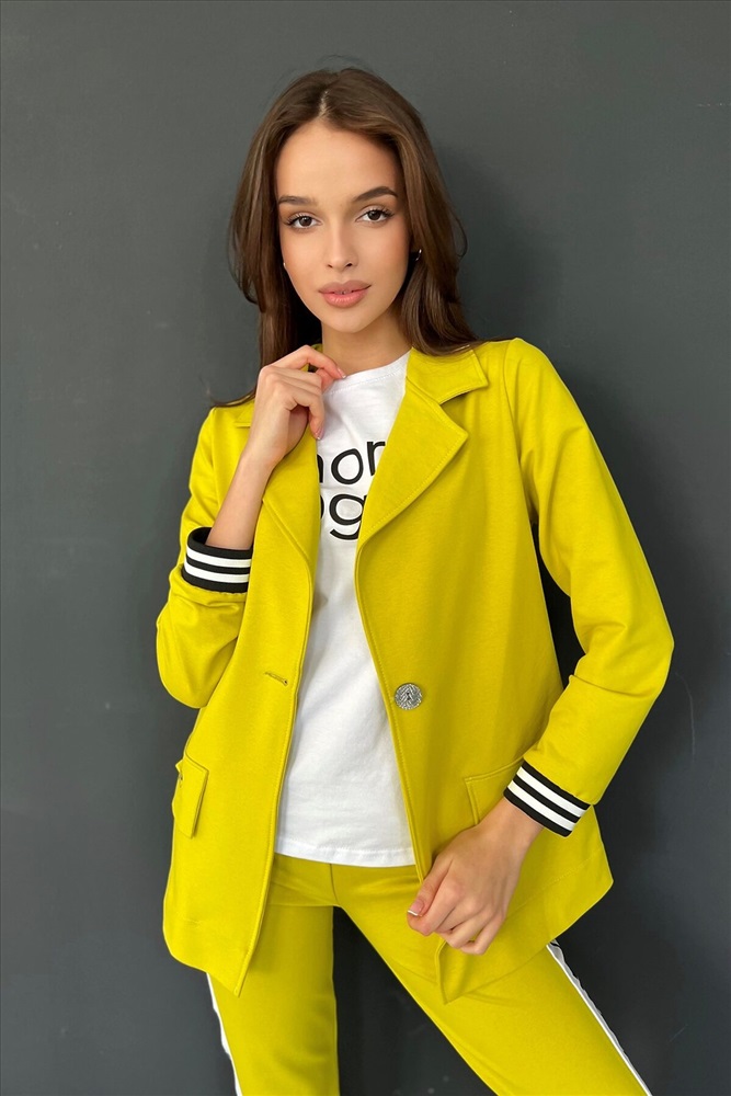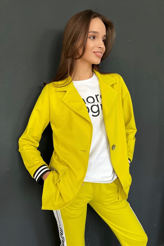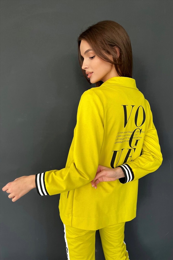 Жакет прямой, длиной до середины бедра, с английским воротником. Рукав втачной, длинный, на эластичном манжете. В нижней части полочки расположены клапаны.