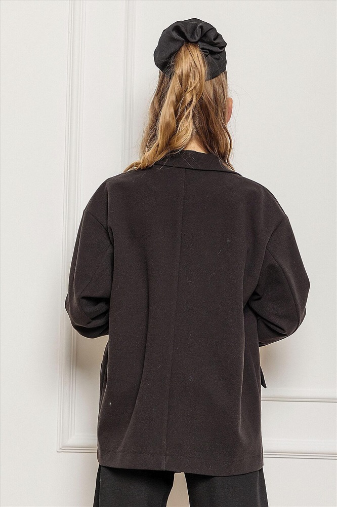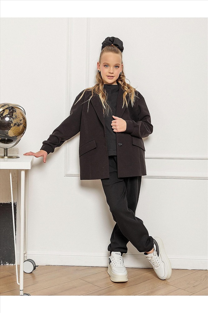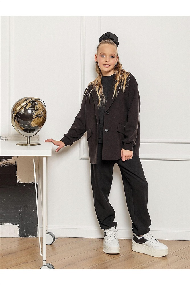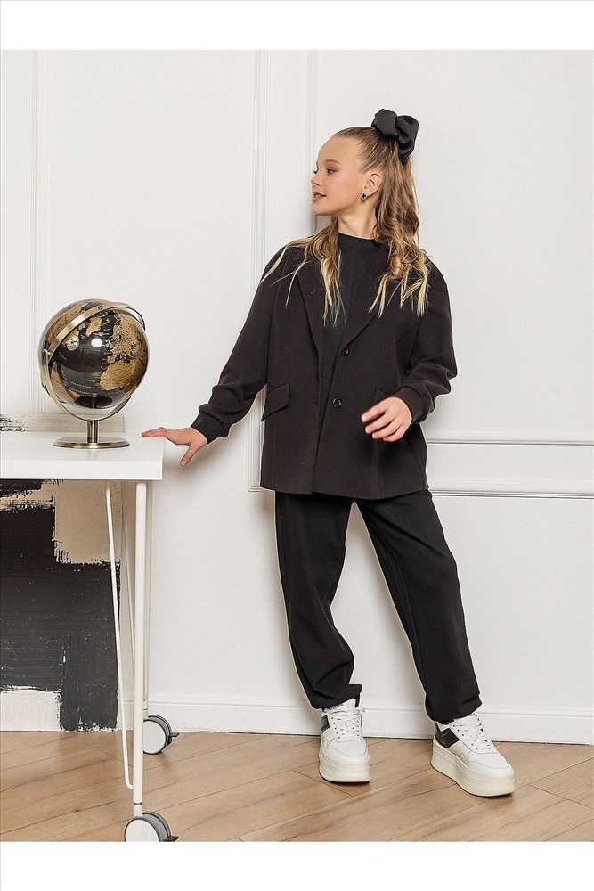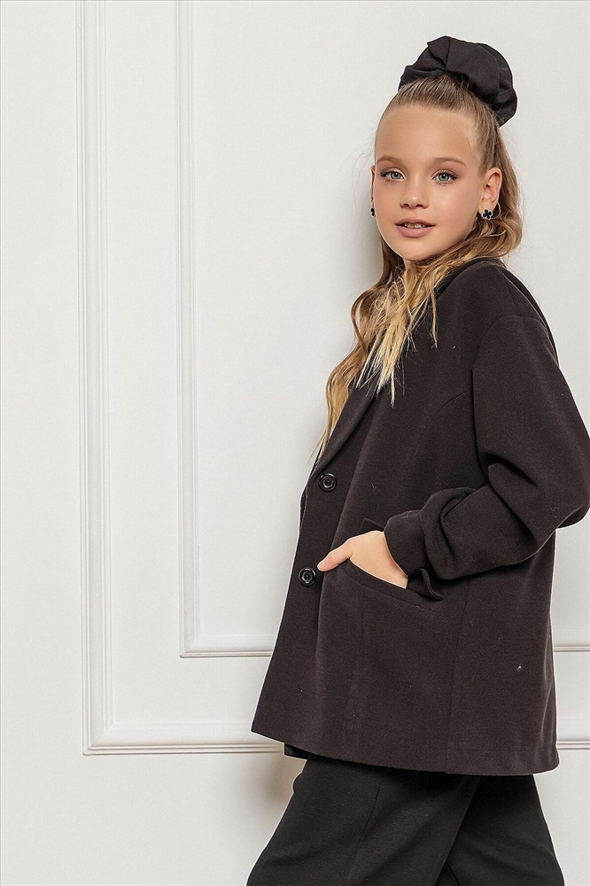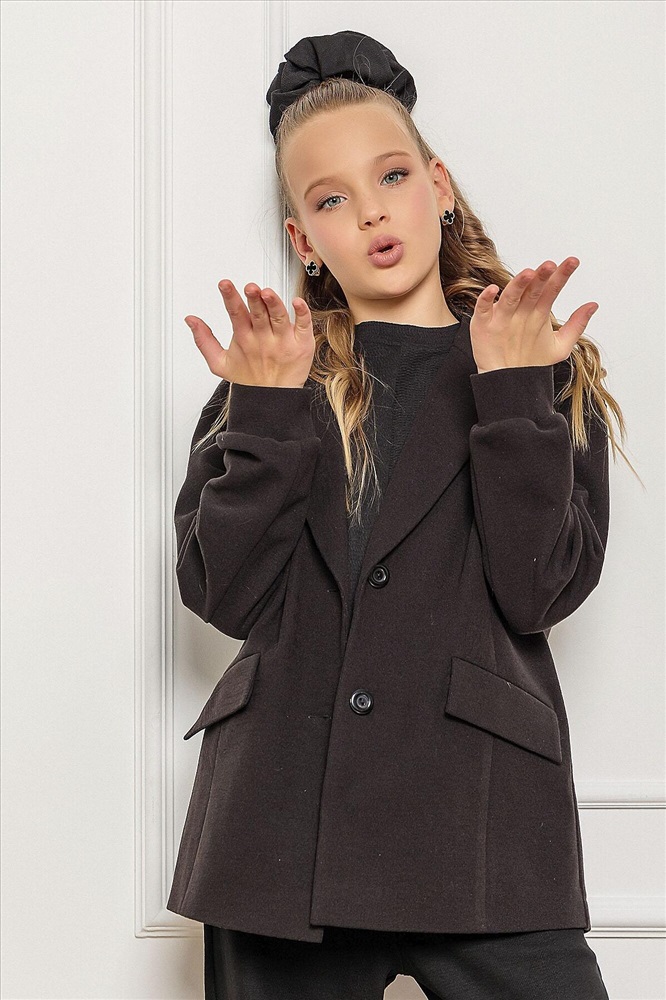Жакет для девочки черный оверсайз однобортный удлиненный. Из трикотажного полотна на подкладе прямого кроя. Два кармана с клапаном, костюмный воротник. Рукав с манжетом.