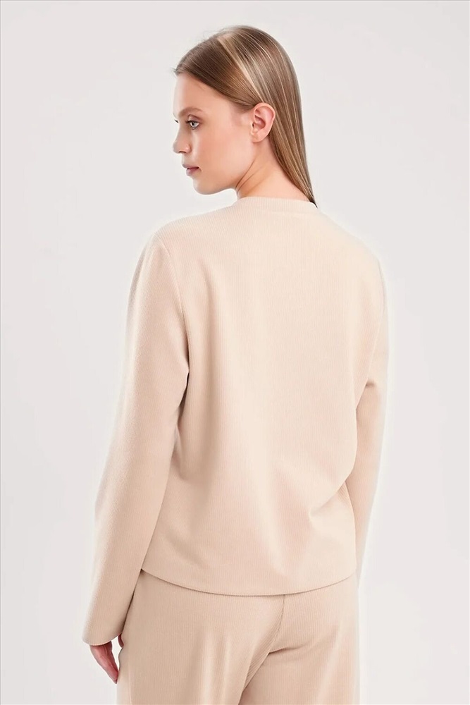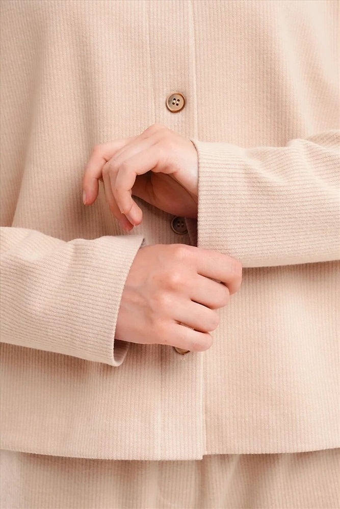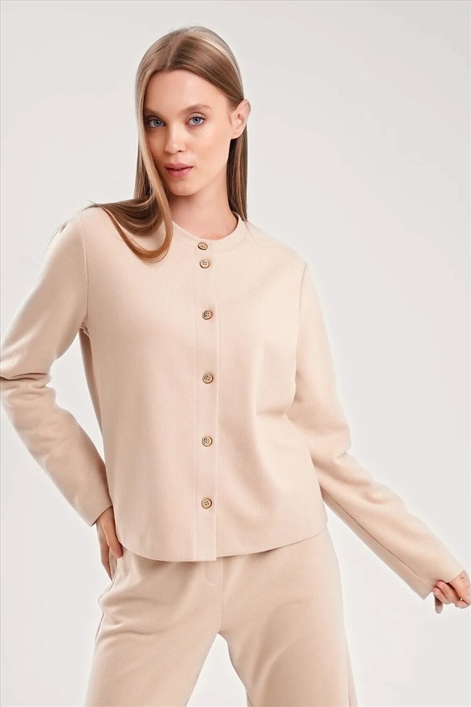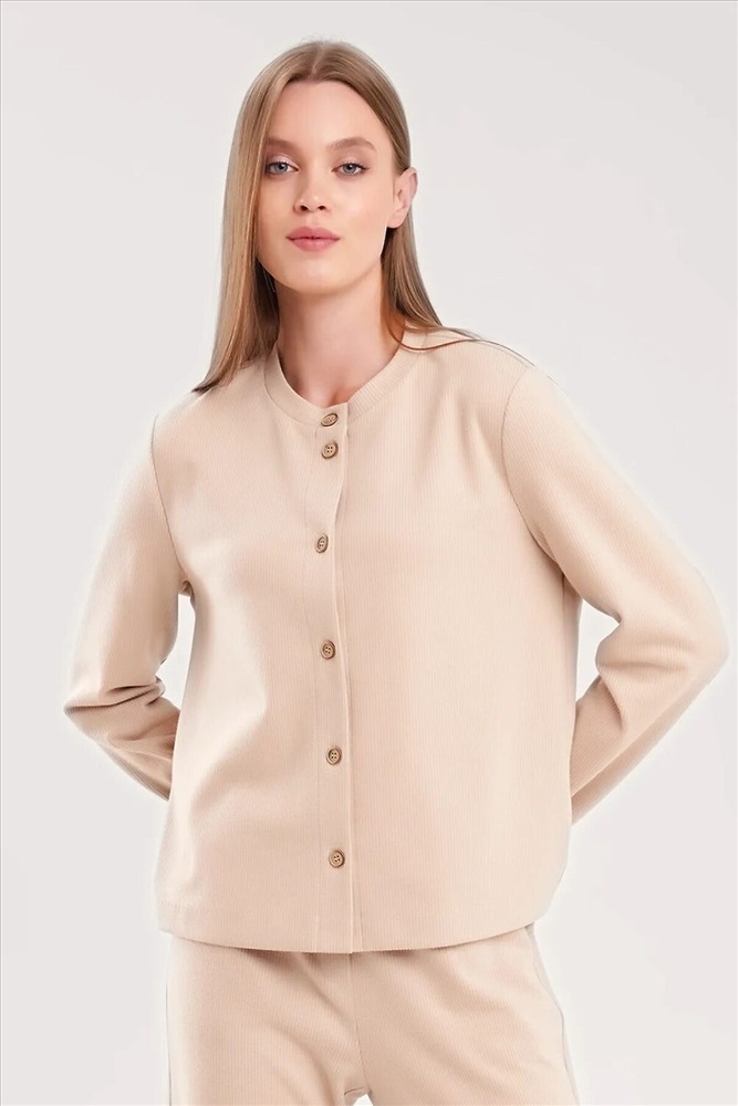 Жакет прямого кроя из трикотажного поливискозного полотна джерси с застежкой на пуговицы. Втачной длинный рукав. Округлая горловина с обтачкой. По низу рукава и изделия потайной стежок.