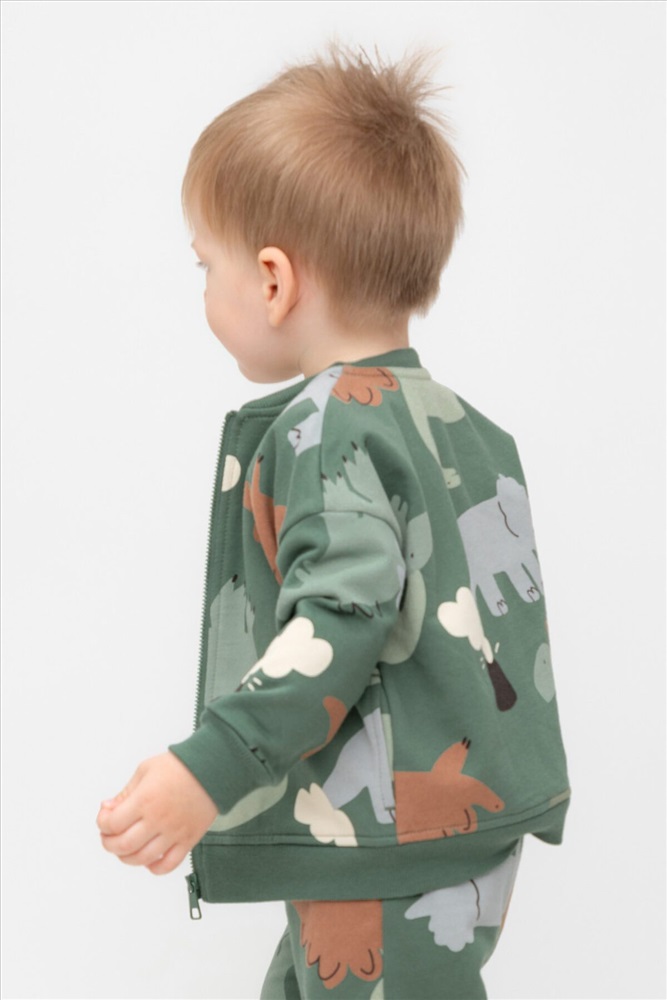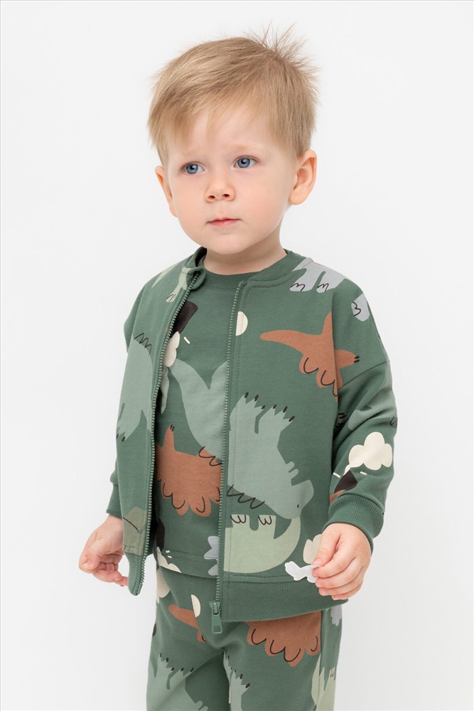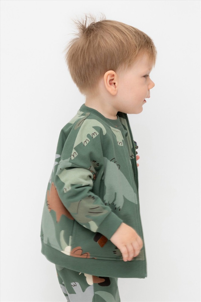 Жакет-бомбер для мальчика из футера с начесом, произведенного из натурального хлопка. У изделия эластичные манжеты и пояс, по бокам карманы. Оригинальная набивка выполнена из стойких текстильных красителей. Куртка сохраняет цвет и форму после многократных стирок.
