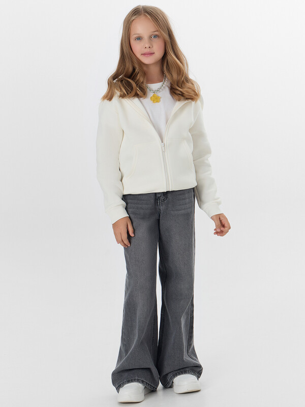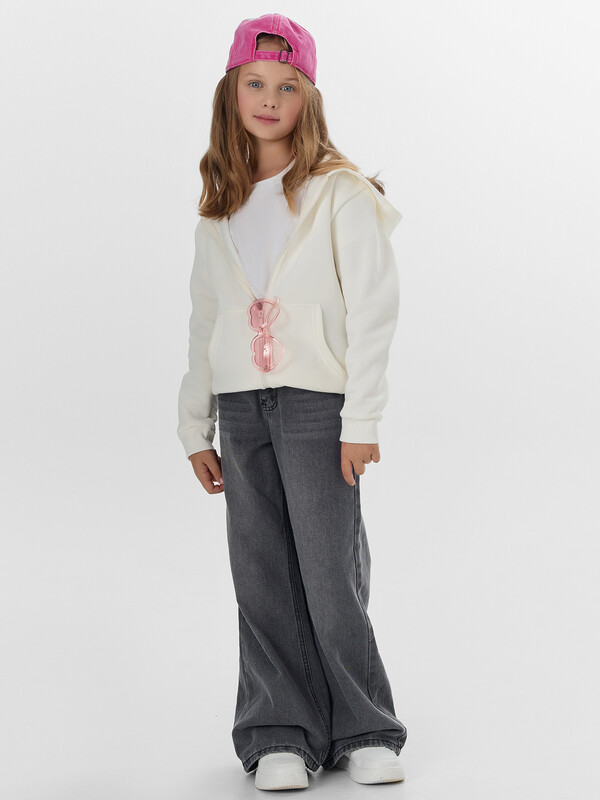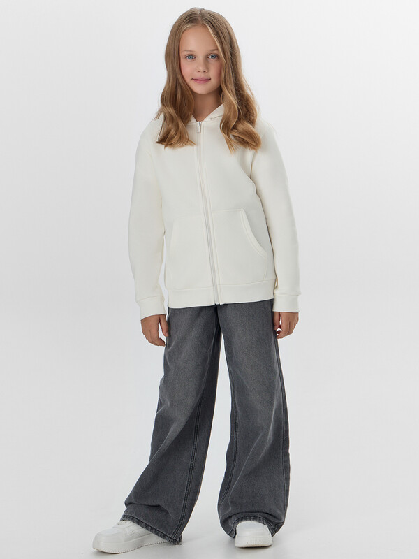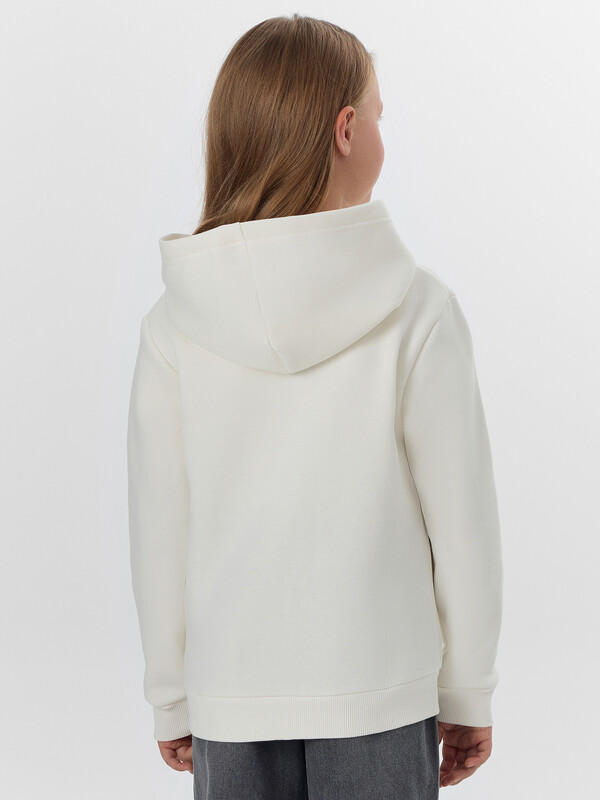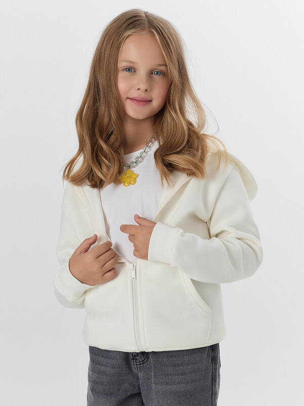 Жакет из трикотажного футера с теплым подчесом. Спущенная линия плеча гарантирует свободу движений. Прямой свободный силуэт, уютный капюшон, длинные рукава на манжетах, удобный карман-кенгуру, центральная застежка на молнию – эта модель наверняка понравится вашей девочке.