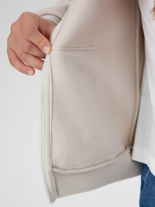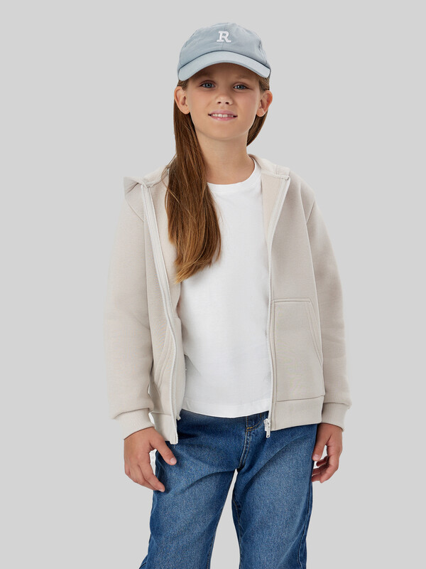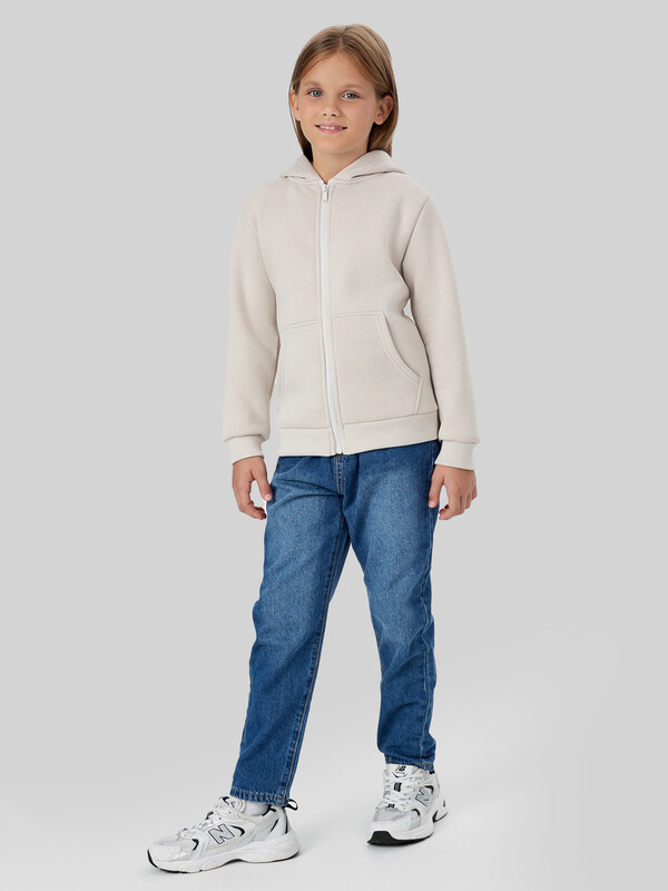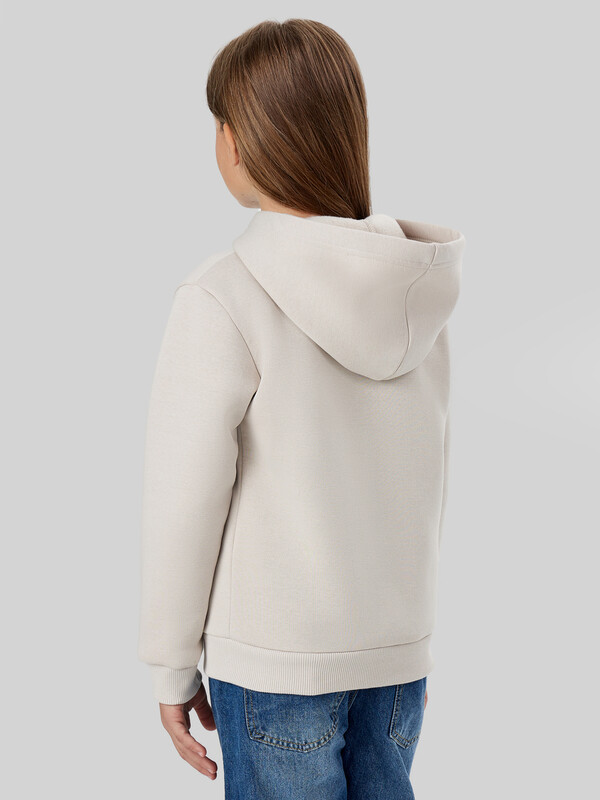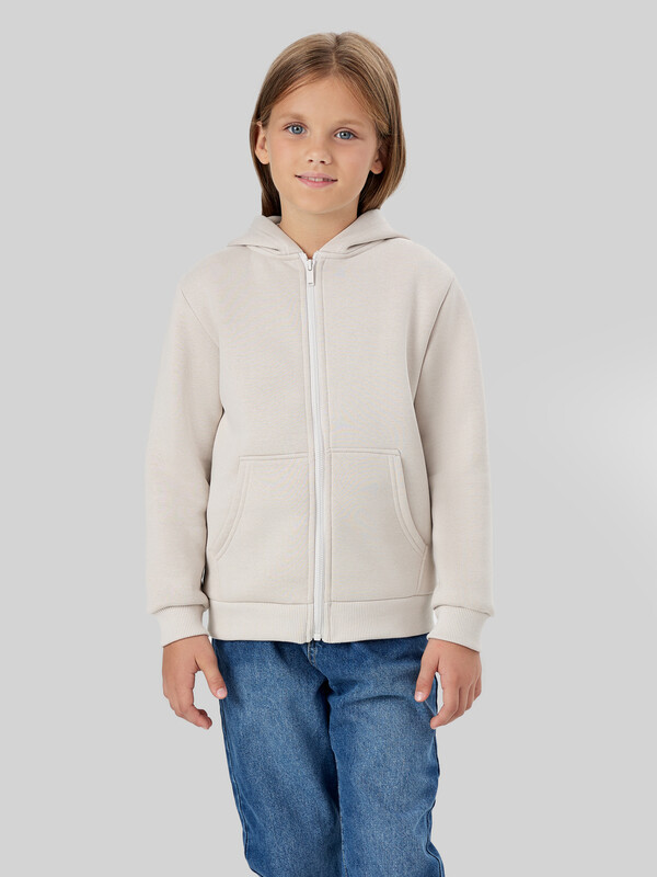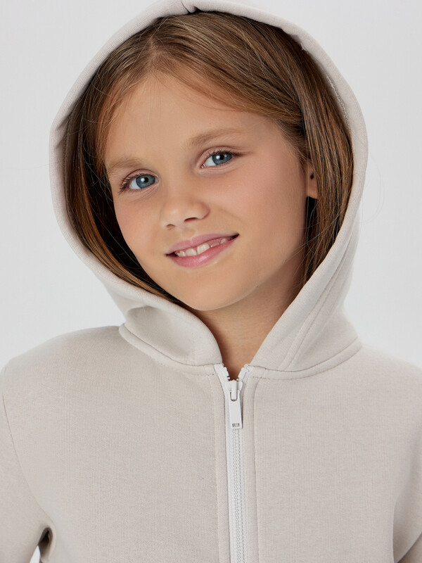 Жакет из трикотажного футера с теплым подчесом. Спущенная линия плеча гарантирует свободу движений. Прямой свободный силуэт, уютный капюшон, длинные рукава на манжетах, удобный карман-кенгуру, центральная застежка на молнию – эта модель наверняка понравится вашей девочке.