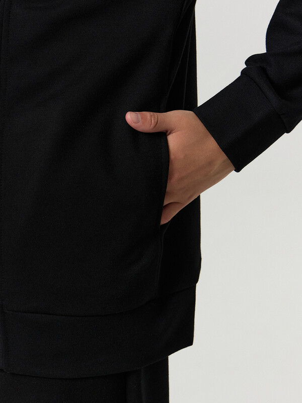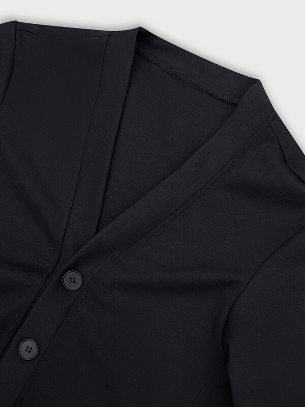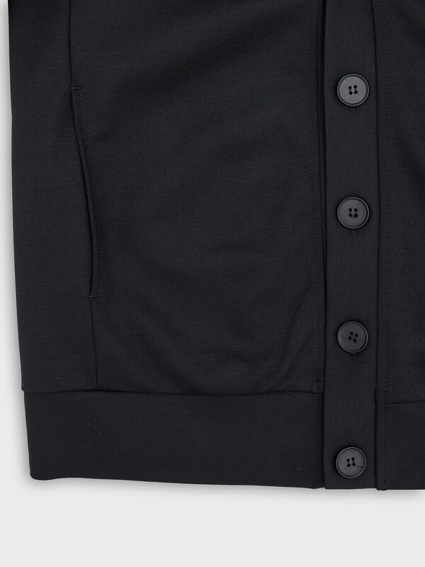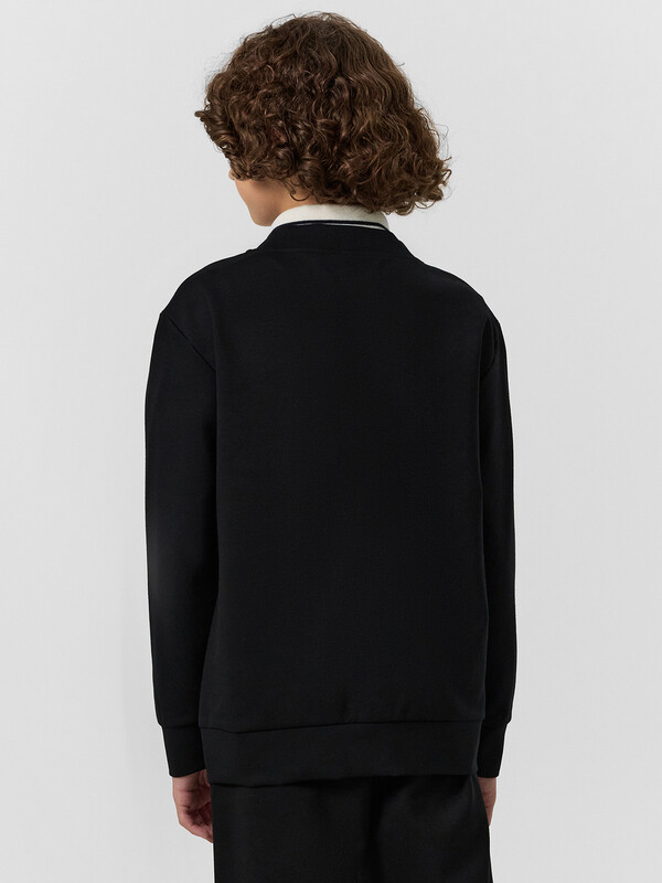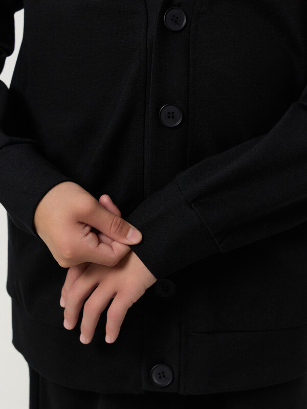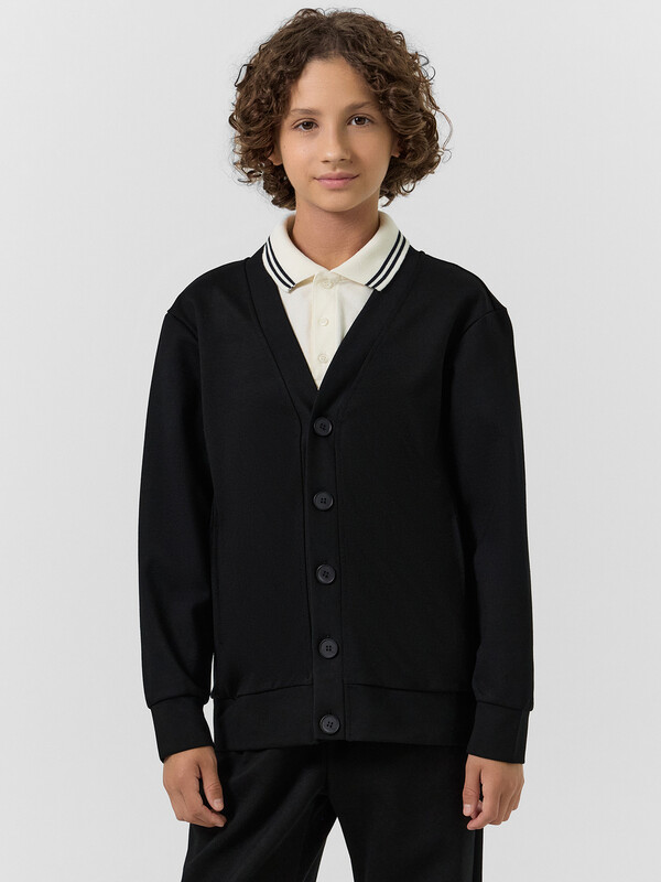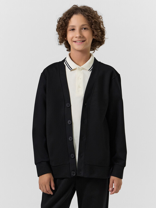 Жакет для мальчиков прямого силуэта. Спинка цельнокроенная, перед с центральной застежкой на пуговицы. Пуговицы на отрезной планке. Горловина V-вырез.