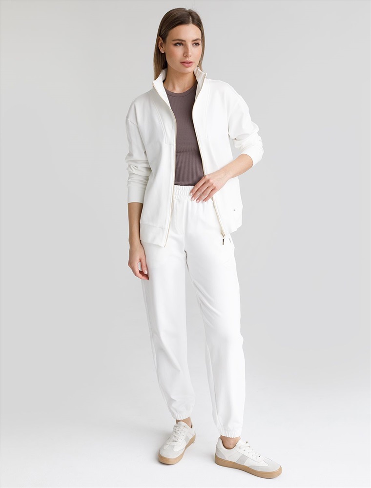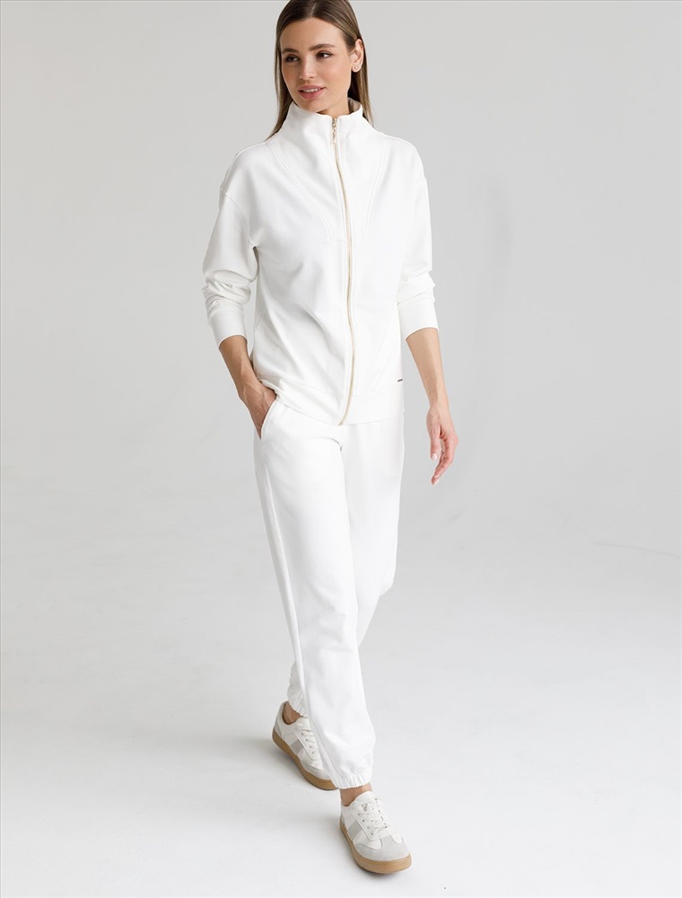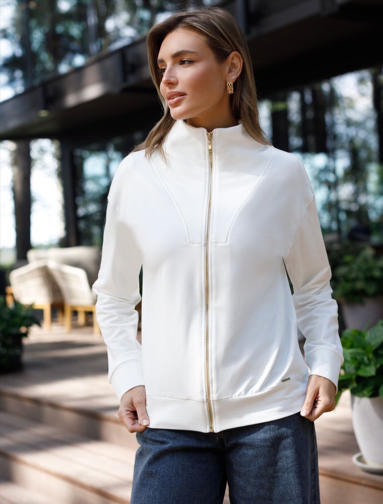 Жакет выполнен из футера двухнитки с эластаном. Модель без карманов с воротом стойка и застежкой на молнию золотистого цвета. Эластичный материал гарантирует комфорт и формоустойчивость. Сочетается в костюме с брюками D44.138, D44.139, D44.140 и шортами D48.008. Изделие дополнено металлическим логотипом бренда.