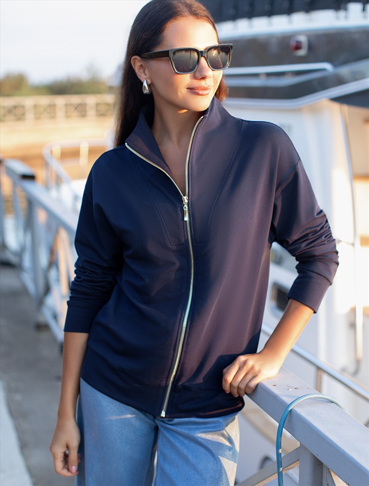 Жакет выполнен из футера двухнитки с эластаном. Модель без карманов с воротом стойка и застежкой на молнию золотистого цвета. Эластичный материал гарантирует комфорт и формоустойчивость. Сочетается в костюме с брюками D44.138, D44.139, D44.140 и шортами D48.008. Изделие дополнено металлическим логотипом бренда.